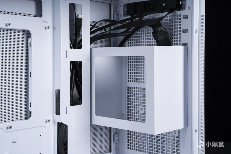 右侧的电源仓采用三档可调节设计,从而满足各种硬件配置的搭配使用,如果显卡长度保持在320mm以内,三档位置可以随意安装。如果超过320mm且超长显卡,那么就需要将电源向上安装,保证显卡与电源安装位冲突,好比我们本次使用360水冷+14cm的ATX+352mm的4080显卡,就需要将电源仓位调整到第二格。
