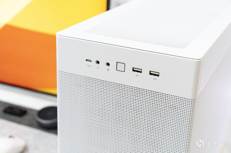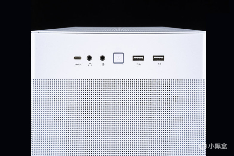 AP201 冰立方机箱IO布置在前面板上部,具备两个 Type-A USB 3.2 Gen 1 接口和一个 USB 3.2 Gen 2 Type-C 接口,两个3.5音频接口和机箱开关,通电后开关边框有灯效。