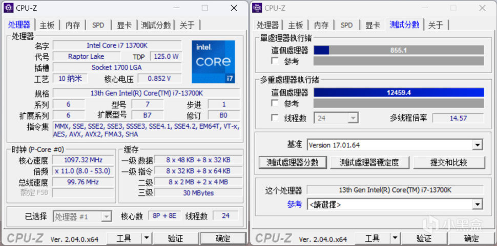 CPU-Z基本信息及BENCH成绩,单核855.1,多核12459.4。
