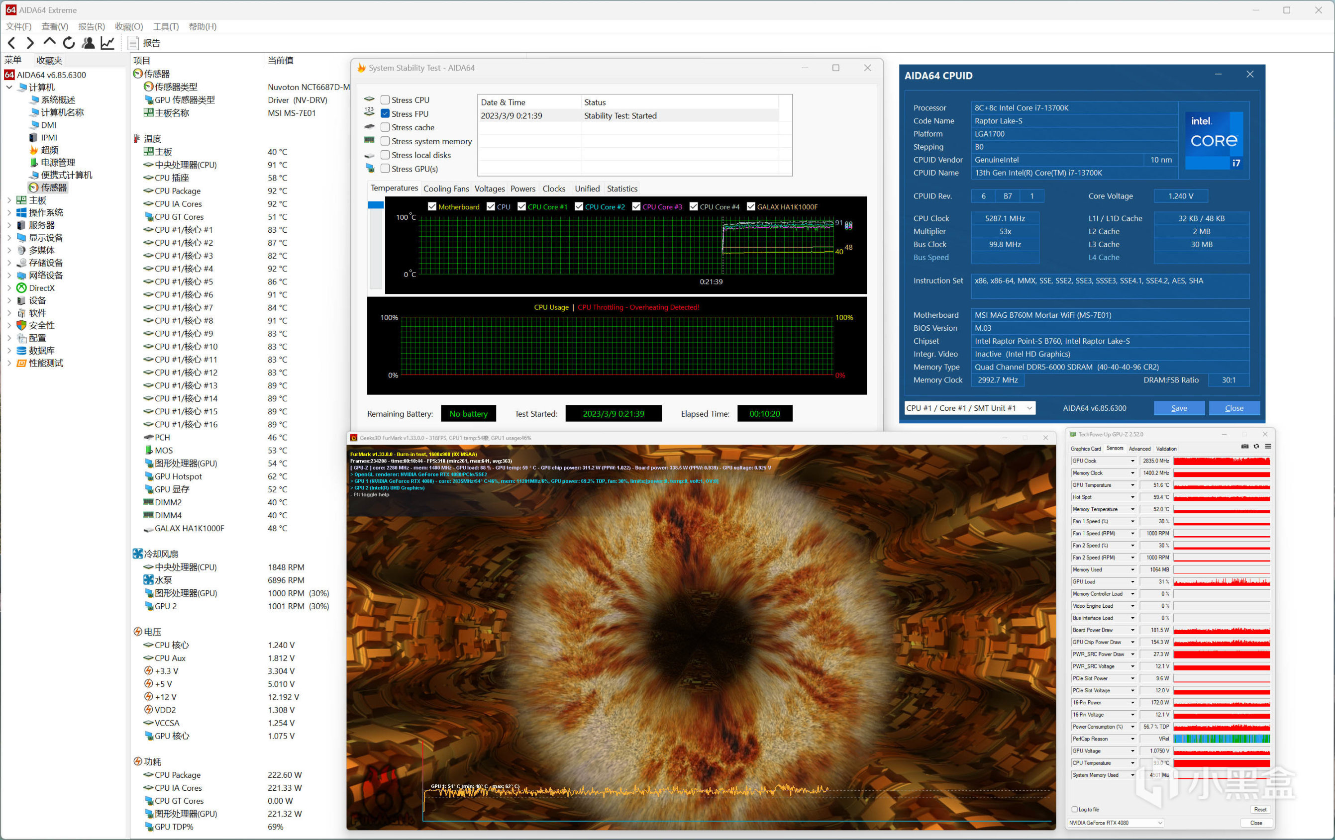 整机双烤测试,CPU 91℃,5.3G,功耗230W,冷排风扇1500rpm。显卡 51.6℃,显卡风扇1000rpm