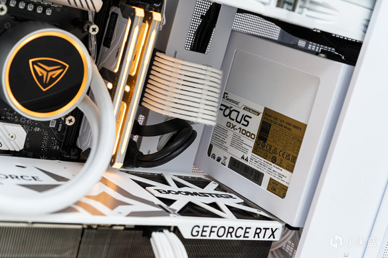 海韵的GX1000 14cm的小巧尺寸正好和352mm的星耀4080进行搭配,多一公分就塞不进去了。本来我是打算用ASUS的雪鹰850W的,但是16cm长度导致和显卡冲突,如果使用的话上方就不能安装360水冷,所以大家要注意,如果你要在AP201里塞下350mm长度的显卡和360水冷,电源不能超过14cm。