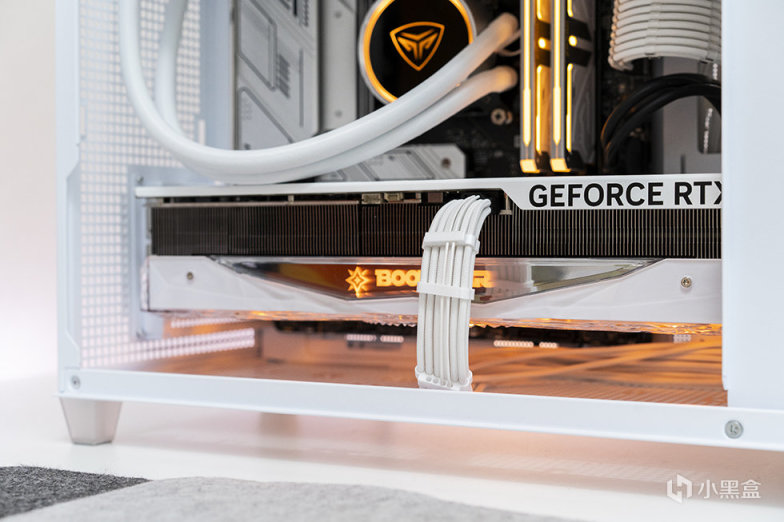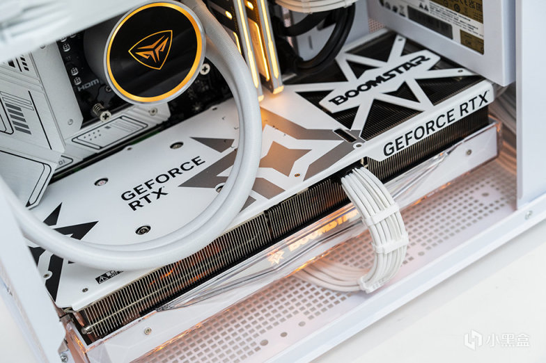 影驰GeForce RTX 4080 16GB 星曜 OC采用越肩设计,占用三个槽位,侧面导风槽上的BOOMSTAR logo采用千层镜光效,通电后有RGB效果。
