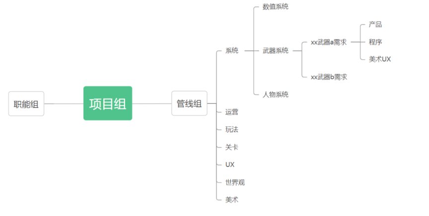 這裏講一下團隊分工。一般手遊開發的團隊分組並非是簡單的塊狀切割,而是併線交叉的。開發過程中的人員會被同時分類到按職能劃分的職能組和按照開發模塊劃分的管線組。