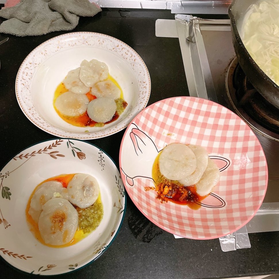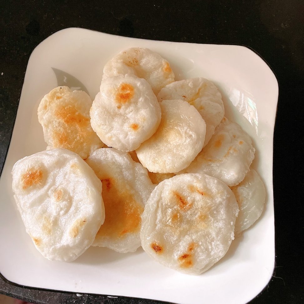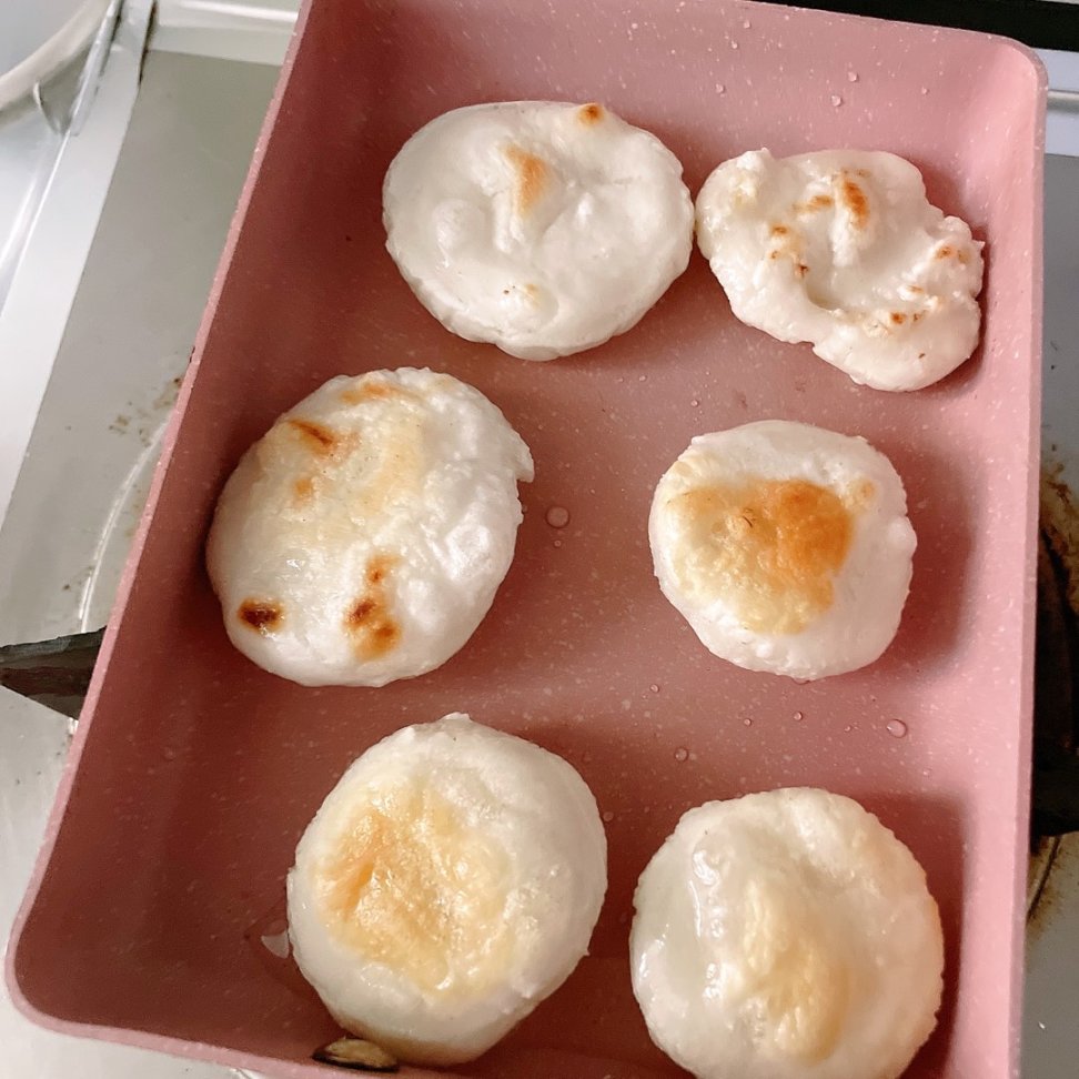 将面团揪下来一小块搓圆按扁,如果觉得粘手可以用清水打湿手,这样糯米粉就不会粘手。这一步没拍照是我确实拍不到,两只手都不空。另起锅倒入微量油放入糯米饼(中小火)