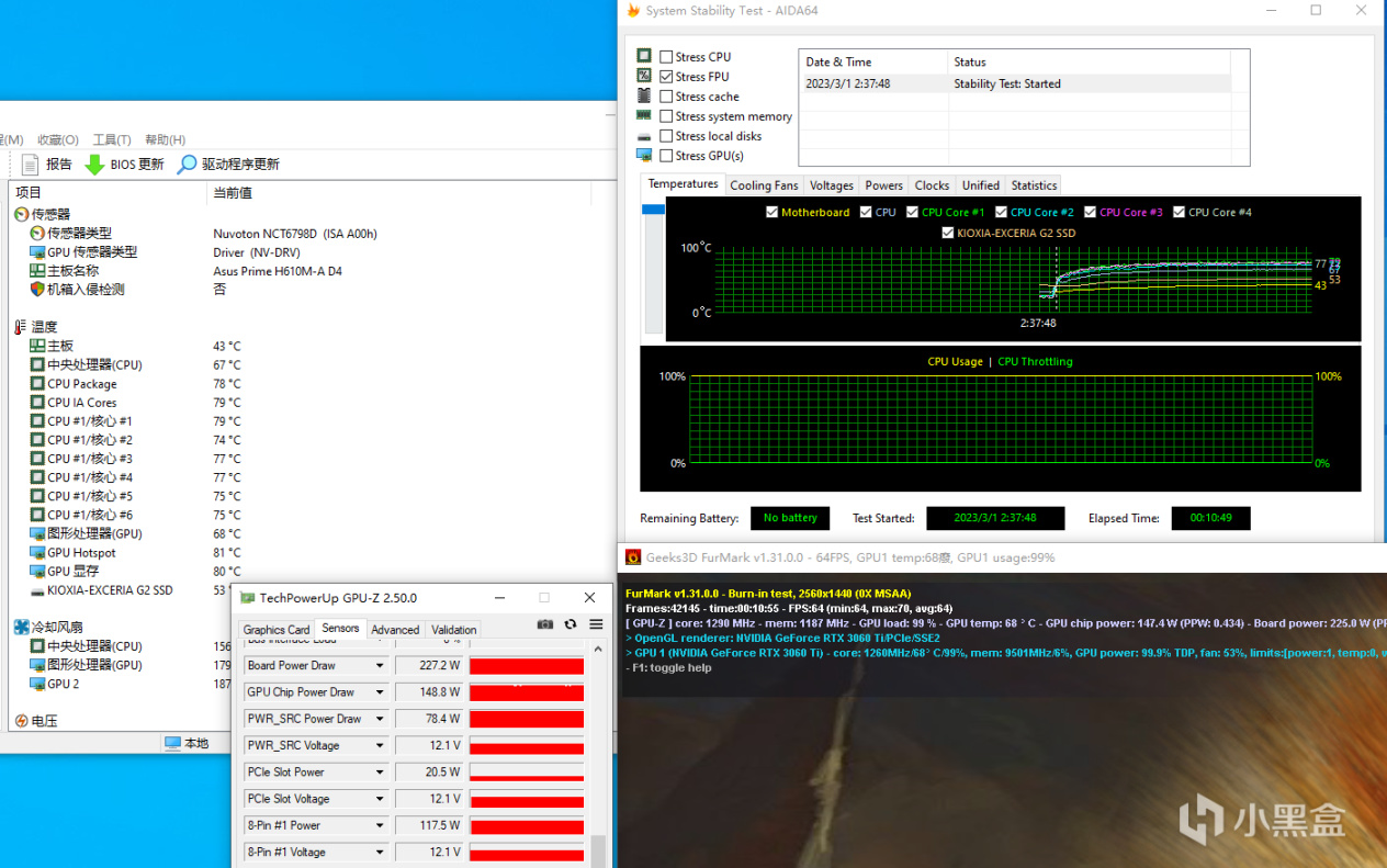 甜甜圈+FPU双烤20分钟,显卡温度68°,CPU温度78°,显卡满载功耗225W左右。(室温25°,机箱侧板合上了)