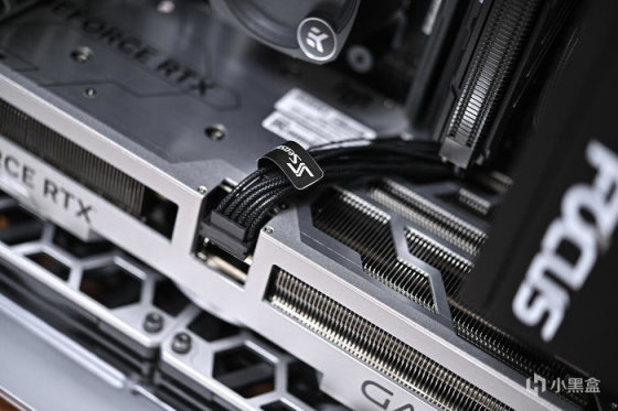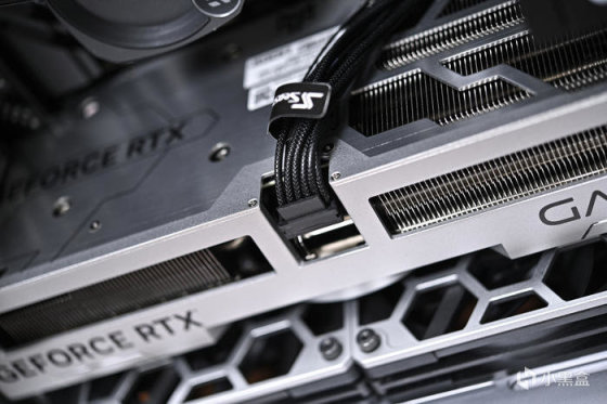 海韻 Seasonic 90 度 L 型 12VHPWR 壓紋模組線。線材採用軟質壓紋線,細緻如編織質感,裝機更美觀,線徑爲 16AWG 高規格線徑。無需彎折,節省空間,安心蓋上機箱側版。這款顯卡設計了接口內凹式設計,配合海韻的模組線效果很好,凹槽正好將線材內嵌其中,側方無線材遮擋。