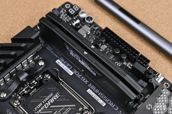 CPU 供電散熱模塊採用一體式設計,頂部覆蓋印有 ROG CROSSHAIR 字樣 Logo,點陣風格。