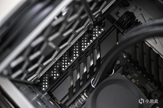 I/O 側的散熱模塊斜切鏤空,內置 RGB燈,支持神光同步,在不通電時呈現鏡面效果。