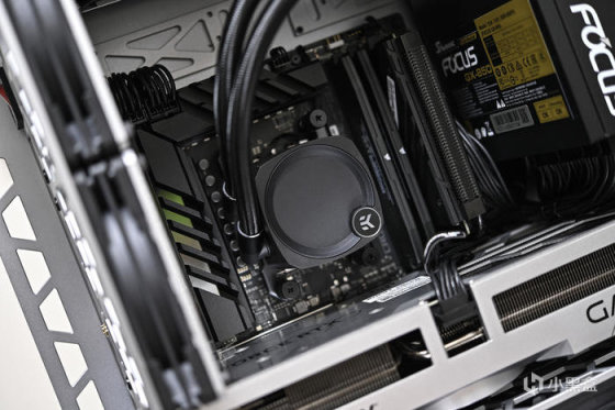 主機主板側展示。本次裝機儘量隱藏模組線材,CPU 雙 8Pin線材沒有使用機箱原本設計的理線位,而是利用機箱加高的主板銅柱將線材藏於主板下方,視覺上觀感會更清爽一些,主板 24Pin 則是利用機箱自帶的理線夾固定於電源下方,正面觀感還是比較和諧的。
