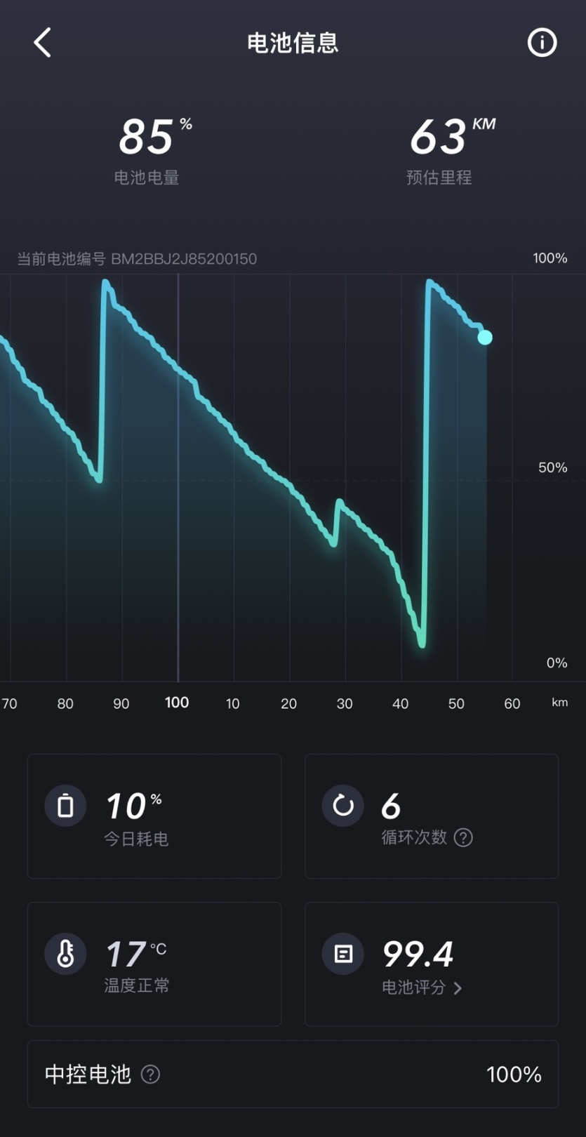 电池信息中可以看到电池循环次数。小牛对1次循环的定义是充放电60%,设计循环上限是1000次,我这块电池目前已经循环了6次(拿到手差不多5次,充满就跳6次了),以我的消耗速度跑个3年毫无压力,不过我大概率会在后面换48v65ah的冰魂电池把续航堆到100+公里。