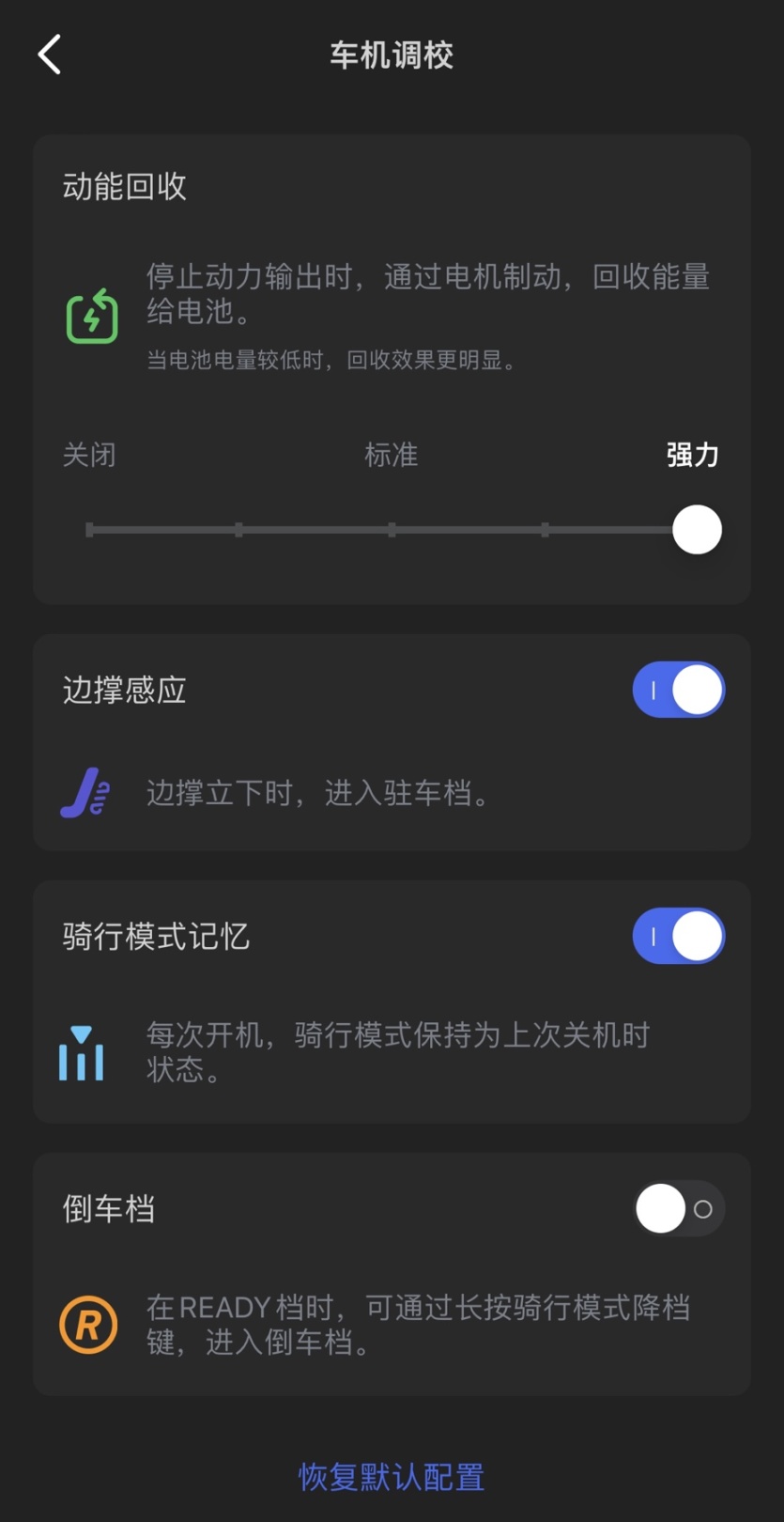 车机设置是我最惊喜的地方,它甚至能设置动能回收力度!这对于强动能回收爱好者真的是大大的福音!我就喜欢松开电门时明显的减速感看到有这么个设置的时候我直接就拉满了,果然比0动能回收时候舒服多了,无动能回收的时候滑行很久都不会明显减速,老是需要刹车辅助降速手有点累的。