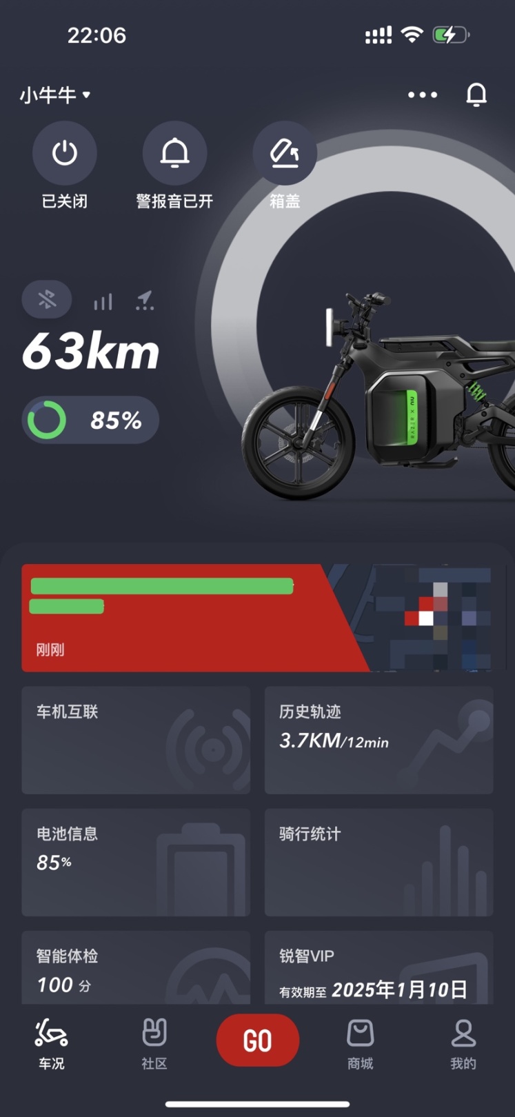 在app的首页可以实时查看车辆状态,包括剩余电量、预估里程、当前位置等,以及历史轨迹、电池信息和骑行统计等数据,还能控制开关锁。