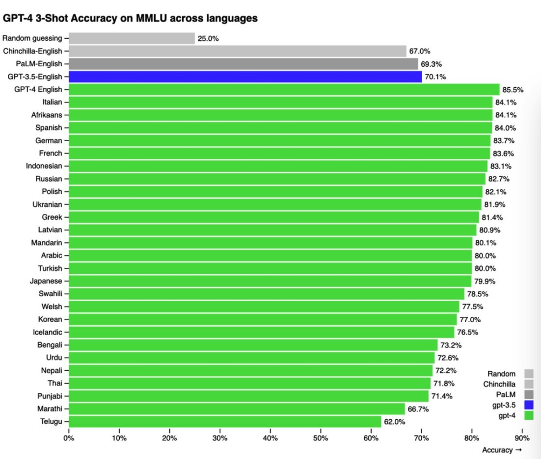 從圖中可以看到,在多語言測試中,GPT-4 準確率不僅高於 GPT-3.5 ,也高於友商的 Chinchilla (DeepMind) 、PaLM (谷歌) 。(我覺得現在最想死的是DeepL)