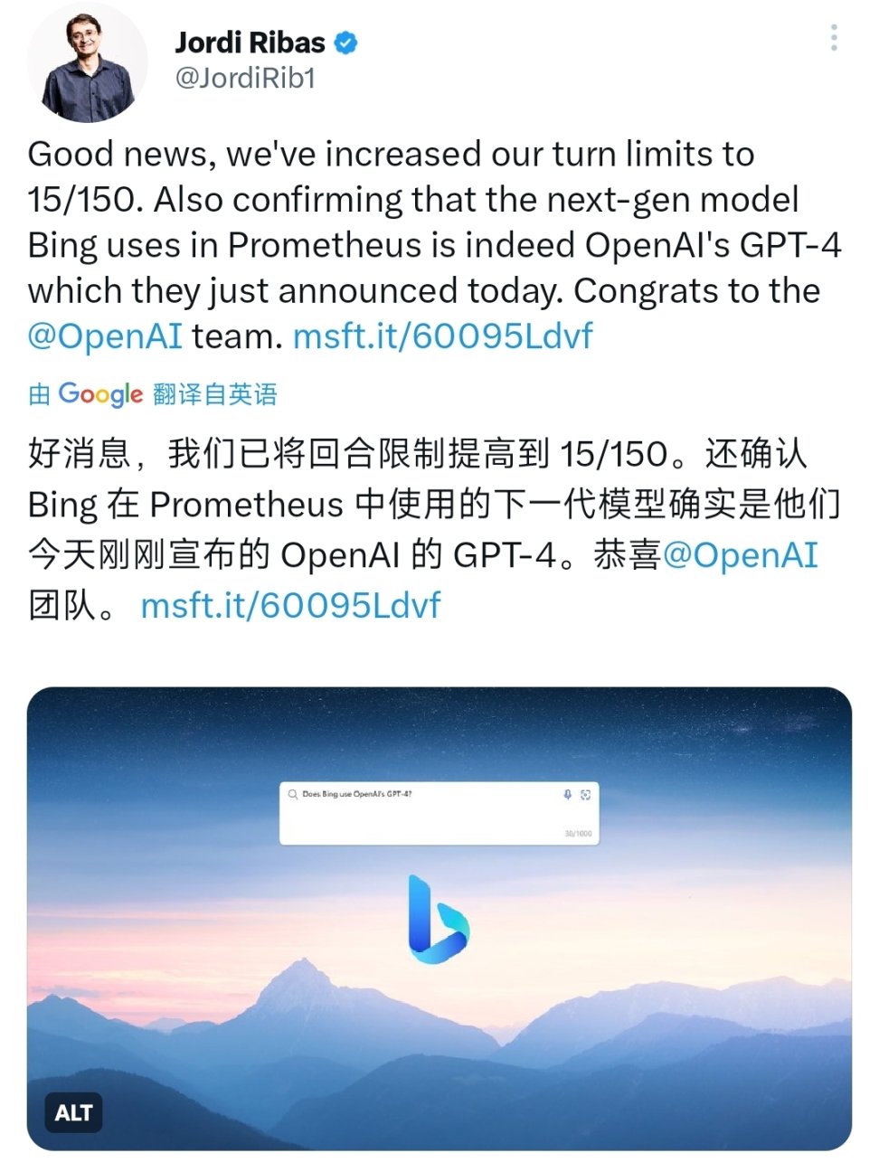 微軟在 GPT-4 發佈後也正式確認 new bing 基於 GPT-4 運行。