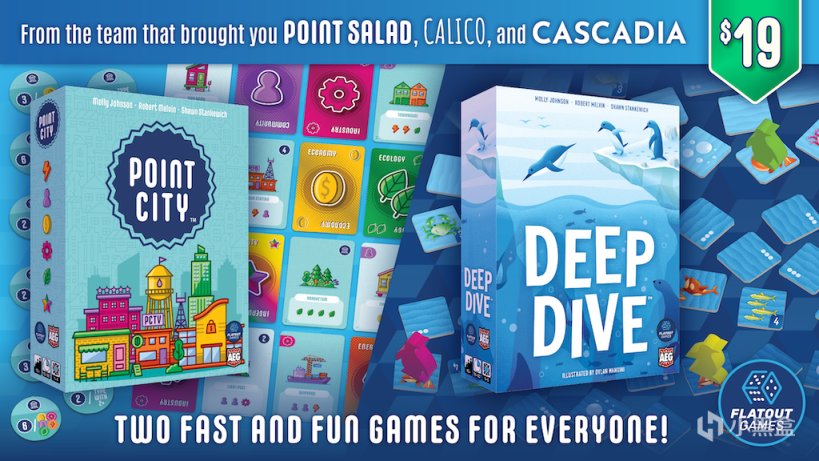 《卡斯卡迪亚之旅》《猫与花毯》的出版商Flatout Games的两款新游戏已登陆Kickstarter众筹,分别为《得分沙拉》系列新作《Point City》,以及一款企鹅主题的“赌狗”游戏《Deep Dive》。