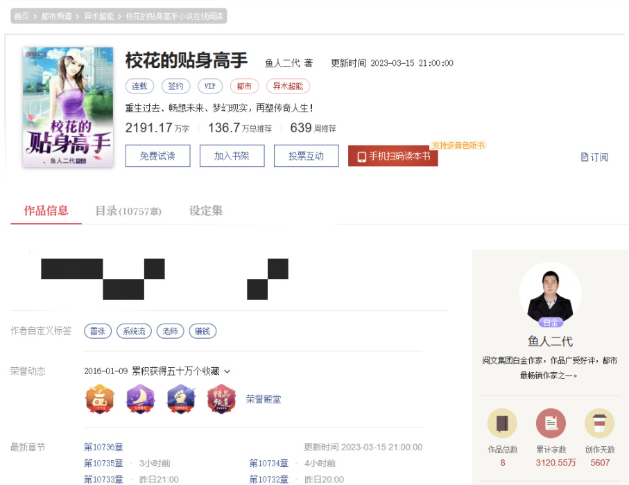 截至到2023年3月15日大禹写这篇文章的时候,已经写了10736章,多达2191.17万字,然后我斗胆的尝试订阅一下第一卷