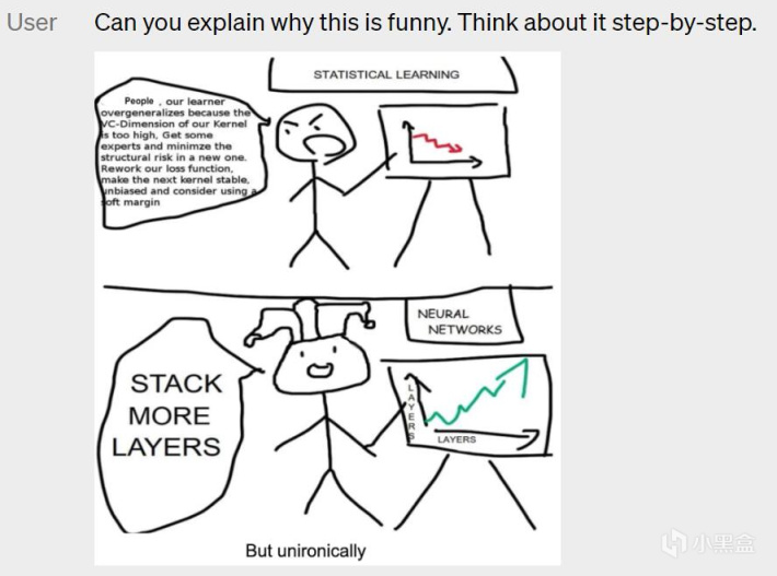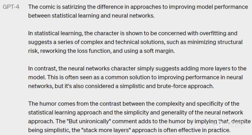 GPT-4给出解释,这部漫画讽刺了统计学习和神经网络,在提高模型性能方面的不同方法。