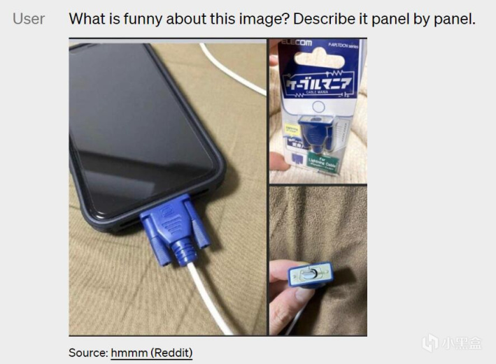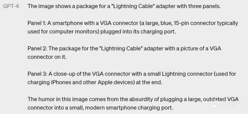 让人没想到的是,GPT-4一本正经地分析,这幅梗图表现了一个“Lightning接口笑话”,即用VGA的线去连接充iPhone,并且这个VGA接口上面其实是一个小的Lightning接口。