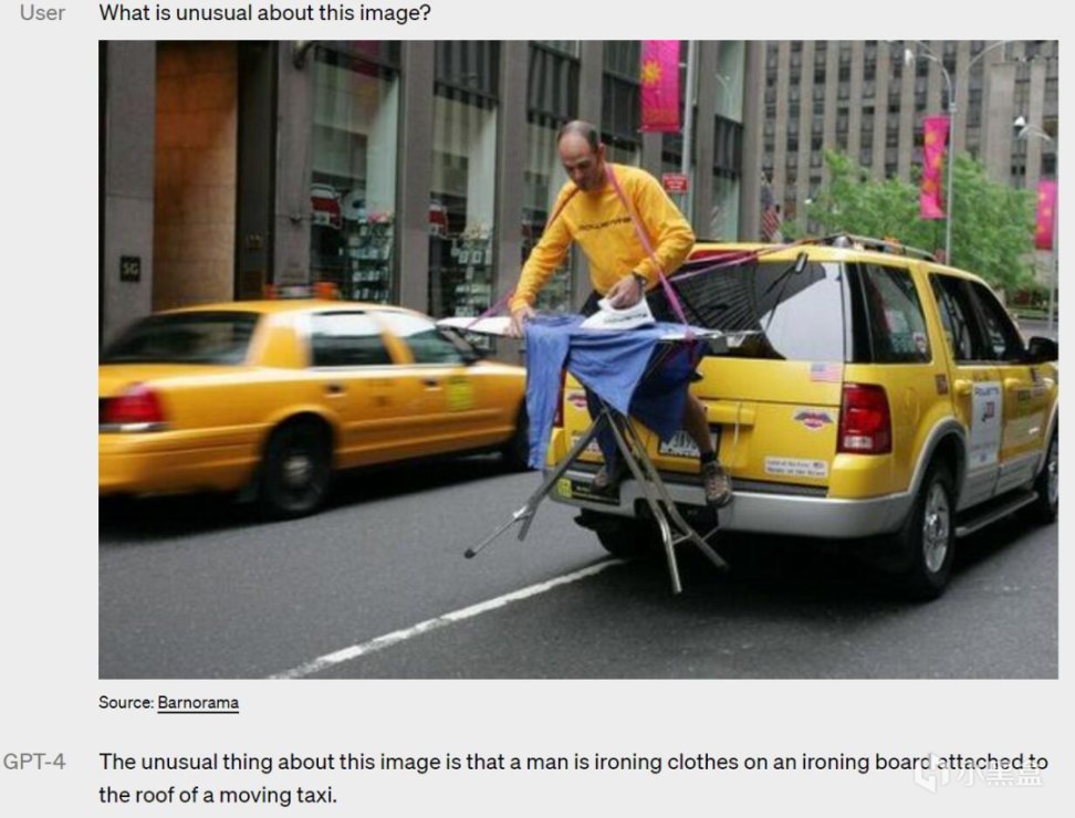 再比如让GPT-4去理解一些荒谬的图片,如下图。GPT-4则是回复,下面这幅图片不寻常之处在于一个男人正在熨衣板上熨衣服,而这个熨衣板则是挂在一辆行驶的出租车的车顶上。