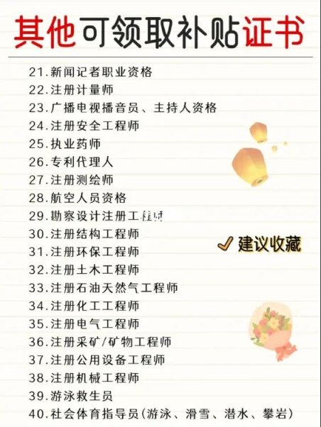 职业资格证书补贴 如果拥有40个指定证书中的任意一个,可以申请一次性1000-2000元的职业资格证书补贴。这个补贴可以帮助你提高职业技能水平,增加求职竞争力。你需要前往当地人才服务中心或者人力资源和社会保障局申请,同时需要提供相关的职业资格证书等证明材料。