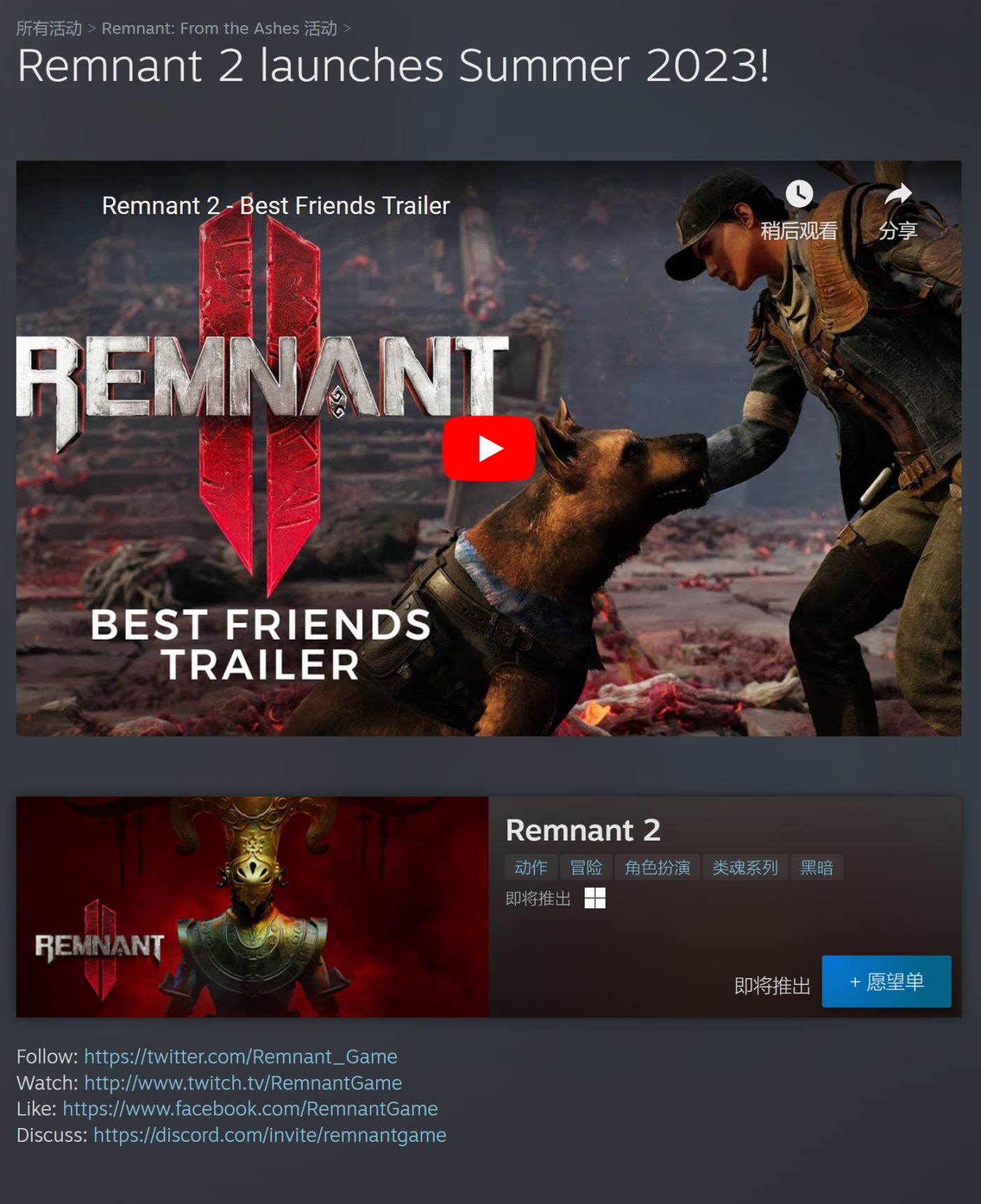 《Remnant II》是暢銷遊戲《Remnant: From the Ashes》的續作。在本作中,人類倖存者將再次深陷可怕的世界,對抗新的邪惡怪物和神一般的敵人頭目。孤軍奮戰,或者與兩名朋友合作,探索未知的深處,阻止邪惡摧毀現實世界。若想取得成功,玩家必須依靠自己和團隊的力量,完成最艱鉅的挑戰,讓人類免於滅絕的命運。