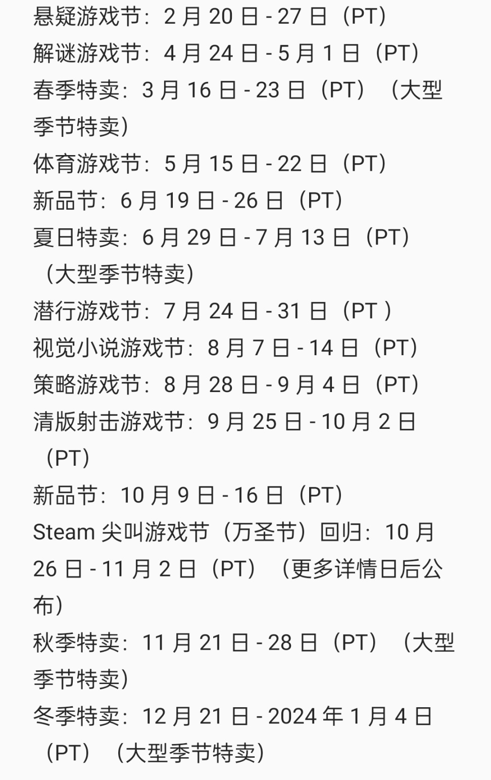 附带一张23年Steam节日日程表