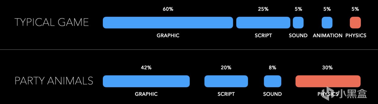 通常来说,⼀个游戏的性能开销由游戏画⾯、脚本逻辑、声音、动画、动⼒学几个部分构成。游戏画⾯⼏乎是所有游戏性能开销的⼤头,几乎很少游戏会像 Party Animals 这样有复杂物理系统的情况下,依然需要保证复杂的渲染效果,如毛发、⼤量动态光源、软阴影和AO等等。
