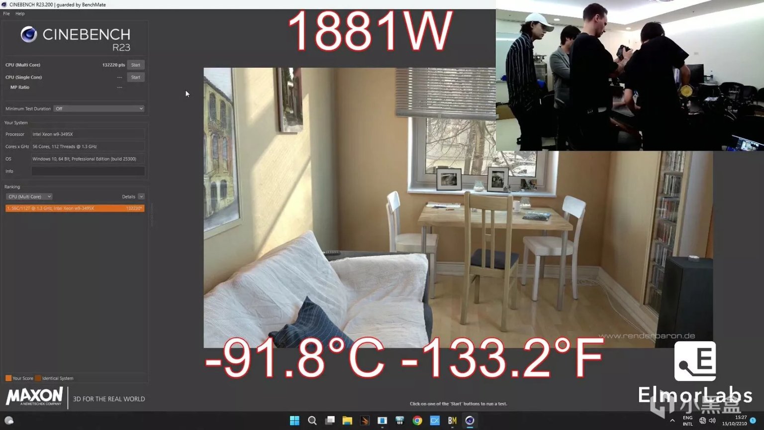 W9-3495X分数达到了132220分,多线程CinebenchR23跑分测试中,CPU功耗为1900瓦,使用液氮进行散热,在-95°C的温度下运行,防止温度瓶颈。132220分是CinebenchR23第二高的分数,仅比最高分低200多分,但这个分数比64核的AMD线程撕裂者5995WX快2倍