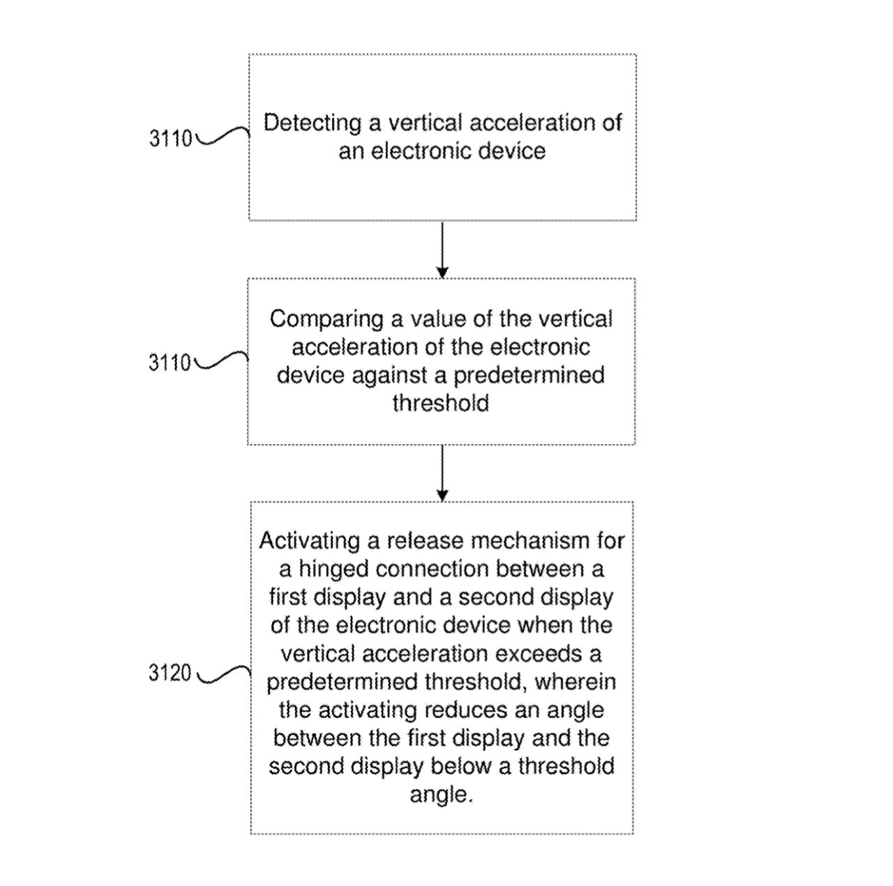 垂直加速度超过预定阈值时,可以激活电子设备的第一显示器和第二显示器之间的铰链连接的释放机制。而卷轴设备则可以自动缩回。