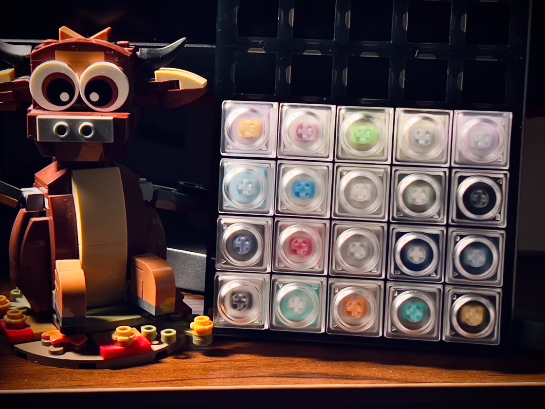 這款鍵帽參考了合成器按鍵的外觀輪廓,做了適配mx軸的款式,不過目前僅有2U和1U選項,加上無刻和盲點設計,幾乎是爲40、普朗克直列等小衆配列量聲打造的玩具擺拍鍵帽。