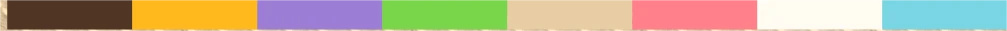 深咖啡色、鮮黃色、淺紫色、草坪綠、帶橙的淺棕色、淺粉色、非常淺的米色、天空淺藍色。