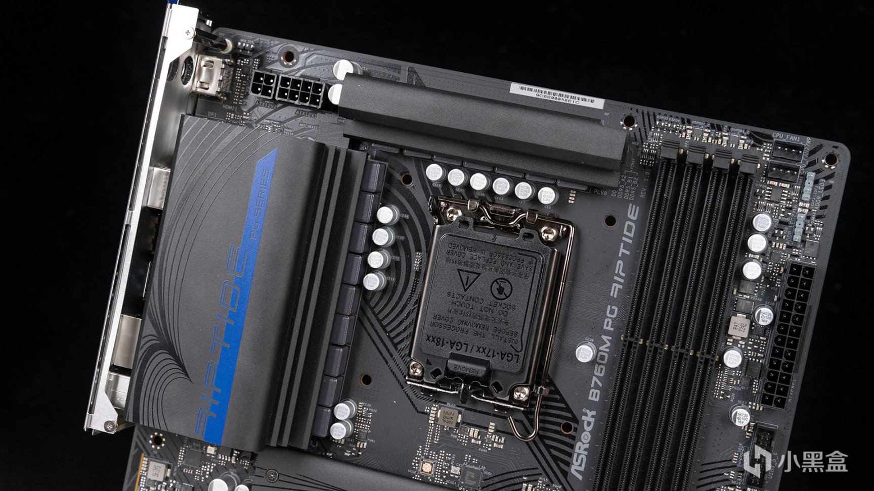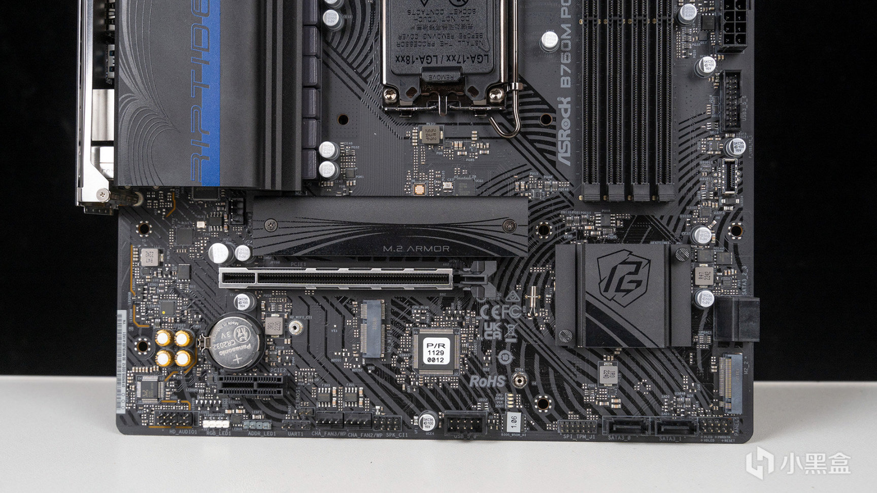 B760M PG Riptide拥有一根全长带钢制加固的PCIeX16插槽,支持Gen 4带宽,另一根是PCIe 4.0X1插槽可用于其他设备扩展,中间的M.2插槽用于安装Key E & 2230类型的WiFi模块。存储M.2插槽则是拥有两个,都是最高支持PCIe 4.0X4,其中第一个是标配散热马甲的。