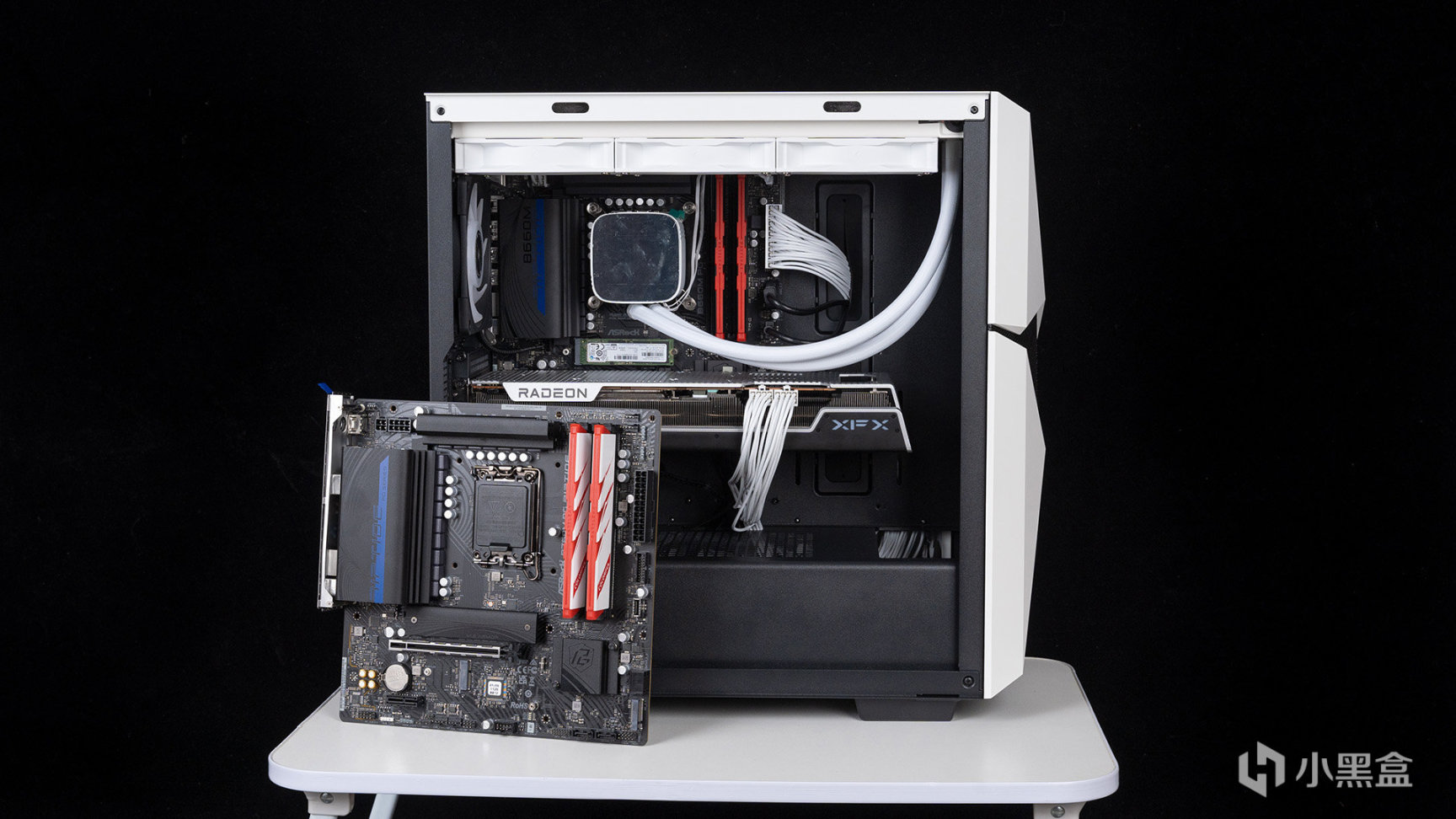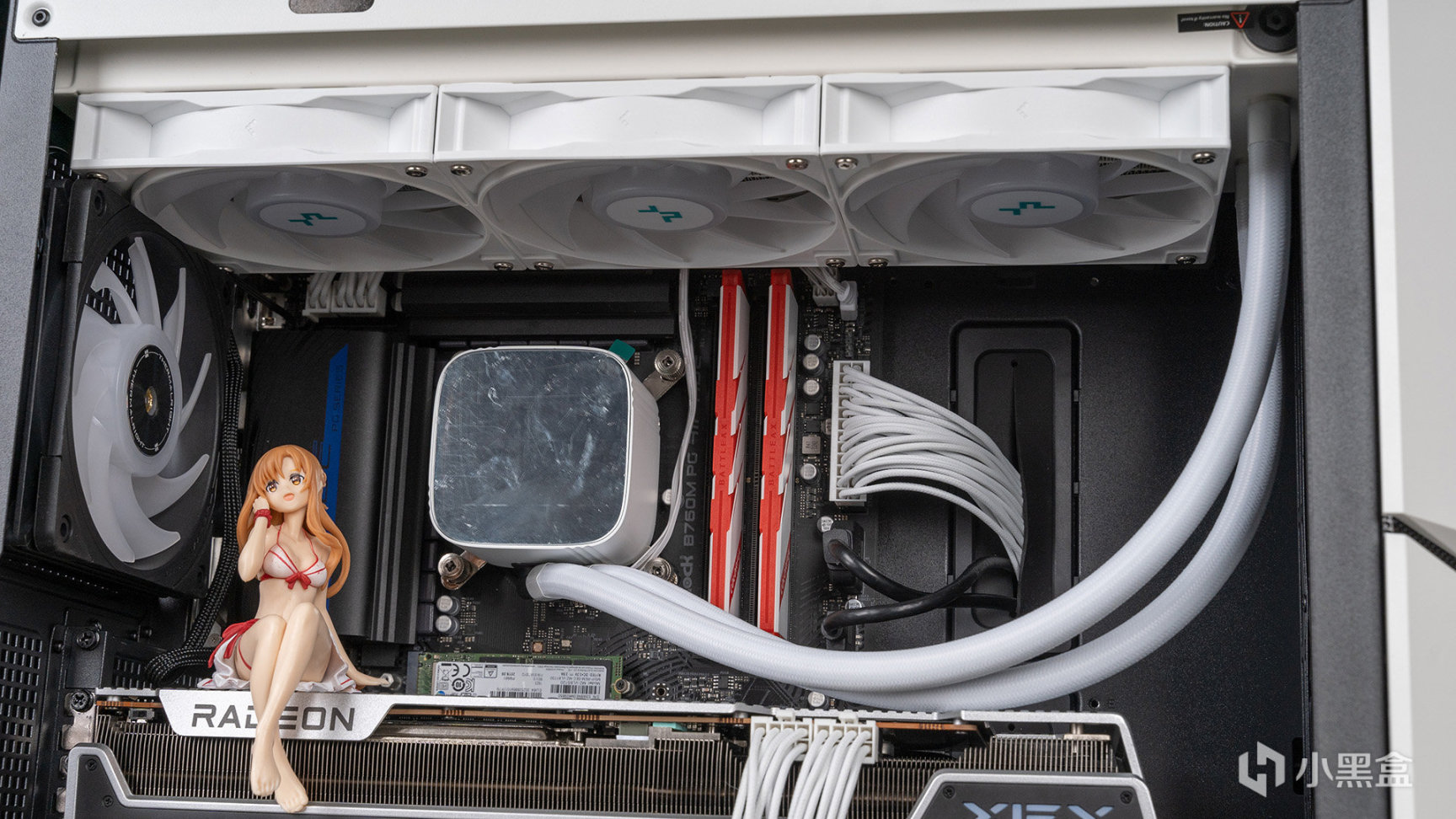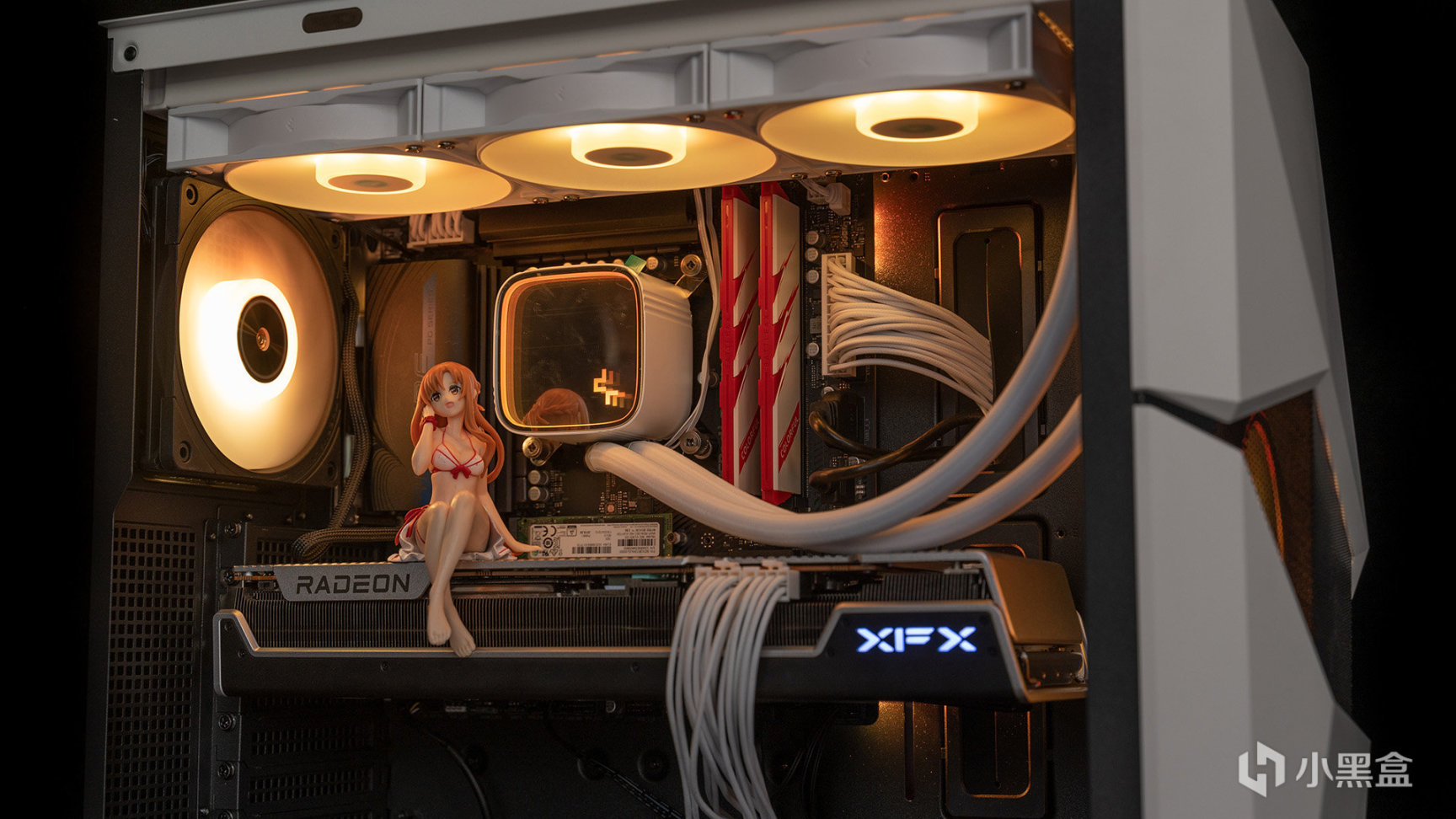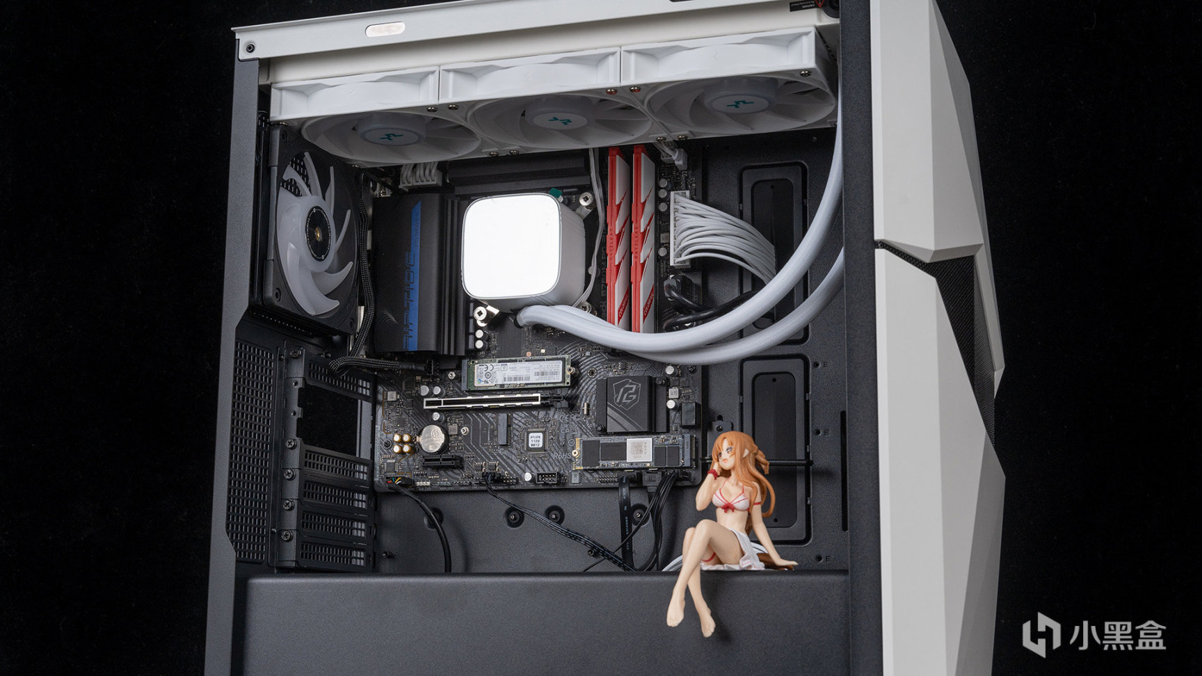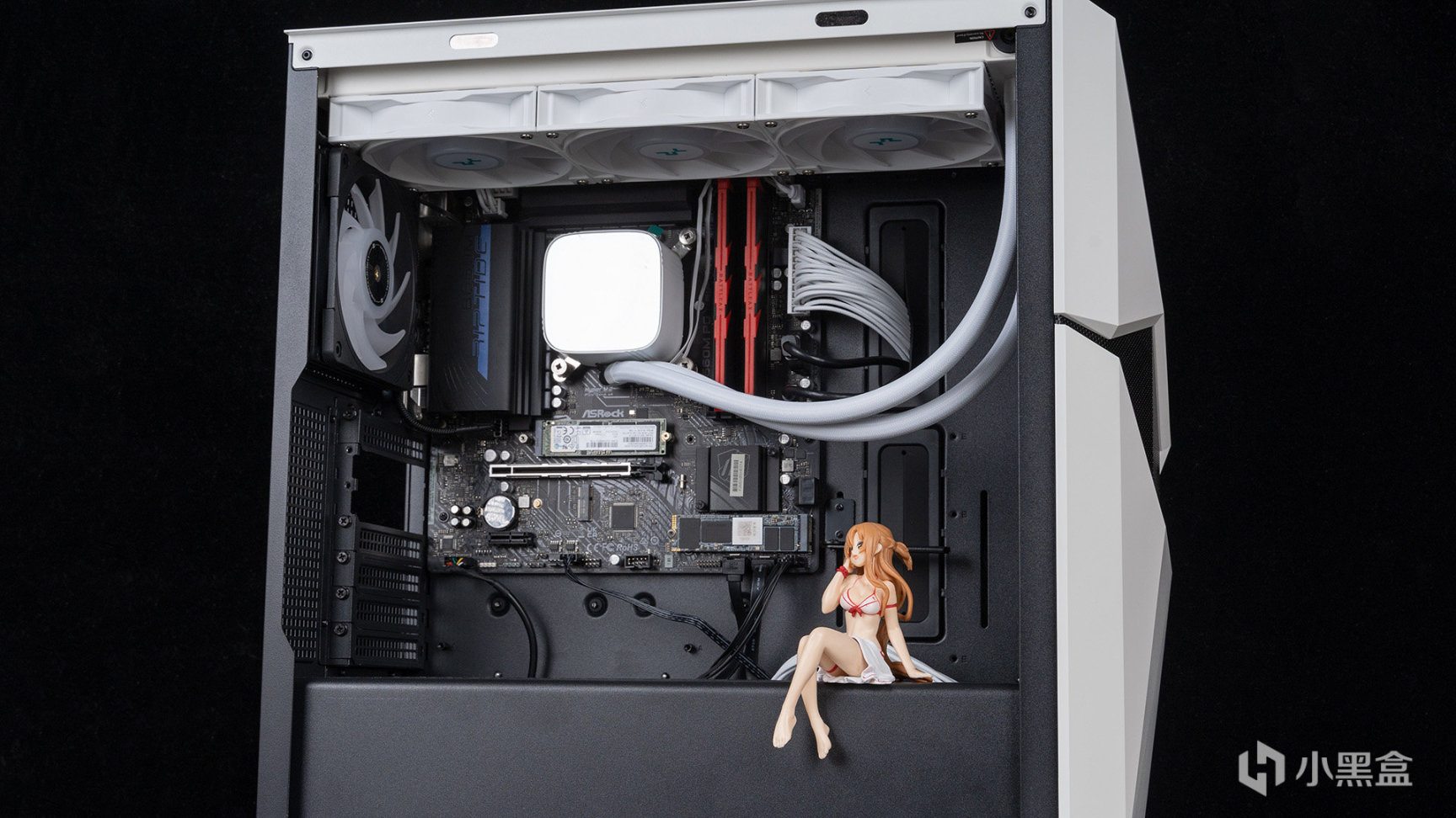 B660M PG Riptide上机效果一览,由于是MATX板型,机箱的下方空间还是很空缺的,整体看起来就很dry,于是把结城明日奈摆上去了,看起来舒服多了。