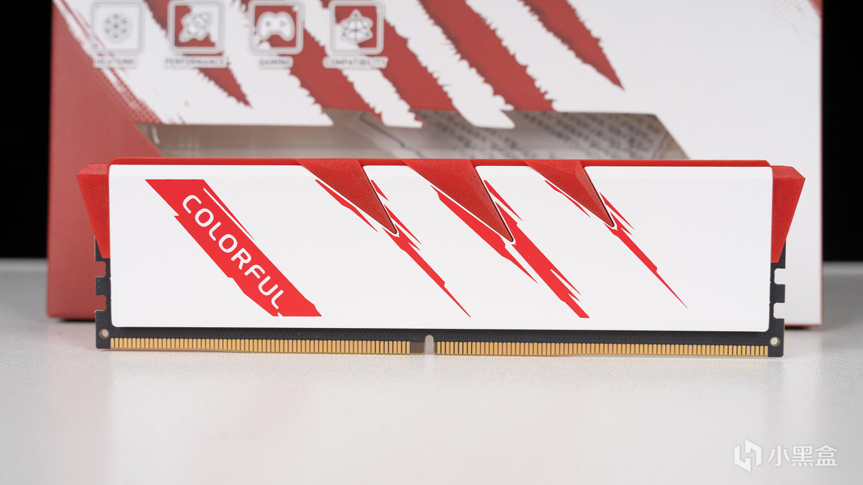 战斧·赤焰DDR5,外观设计是白色作为本体色,以深红色作为点缀,顶部虽然没有LED灯光,但是说实话一抹红实属抢眼,用于白色系无光主题装机,整体视觉效果是不错的。