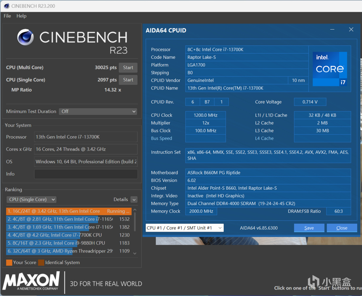 而CINBENCH R2310分钟循环跑分中,i7-13700K最终多核达到30025 pts,单核最终则是2097 pts,B660M PG Riptide和i7-13700K的组合对多核分数并没有影响太大,和Z690/Z790的搭配最多也就差距3%左右,单核分数则是不影响。