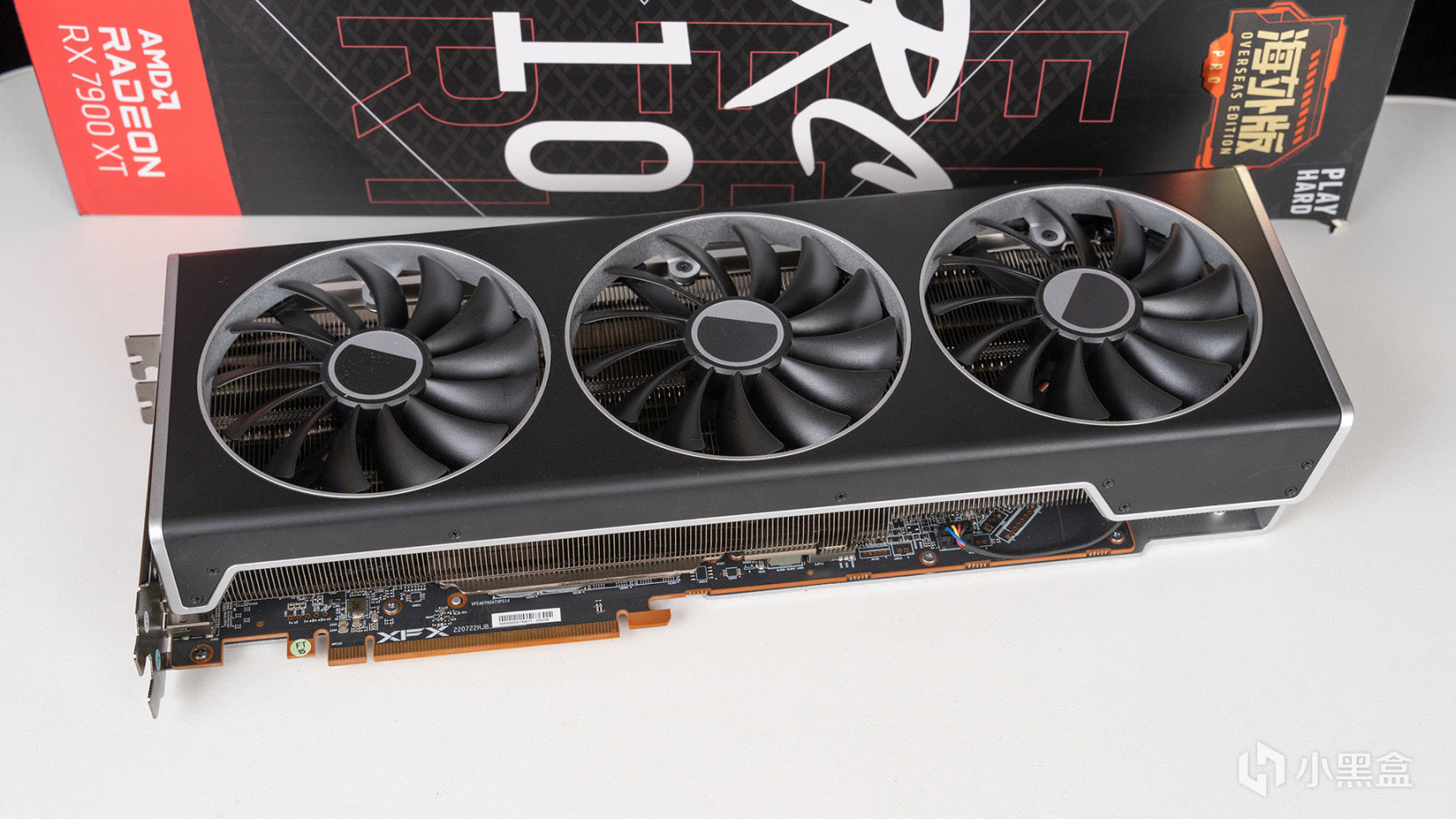 RX 7900 XT海外版Pro的设计可以用两个字形容:更加低调沉稳,毕竟海外版针对的用户就是海外市场,外观没有任何纹路修饰,正面是三枚100mm规格风扇组成,轴心上也没有LOGO,整体简洁都甚至高于上一代,有一点值得关注,导流罩是金属材质的,也就是该卡追求质感多一些。