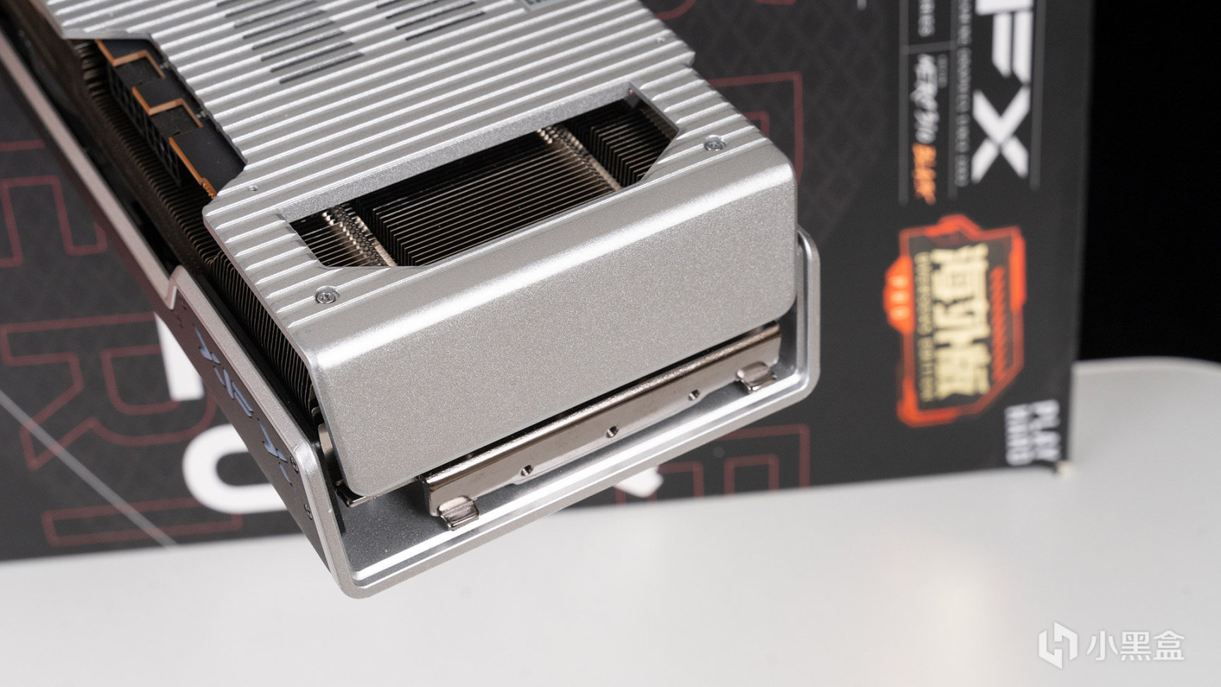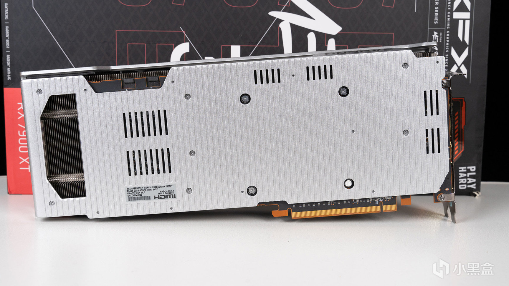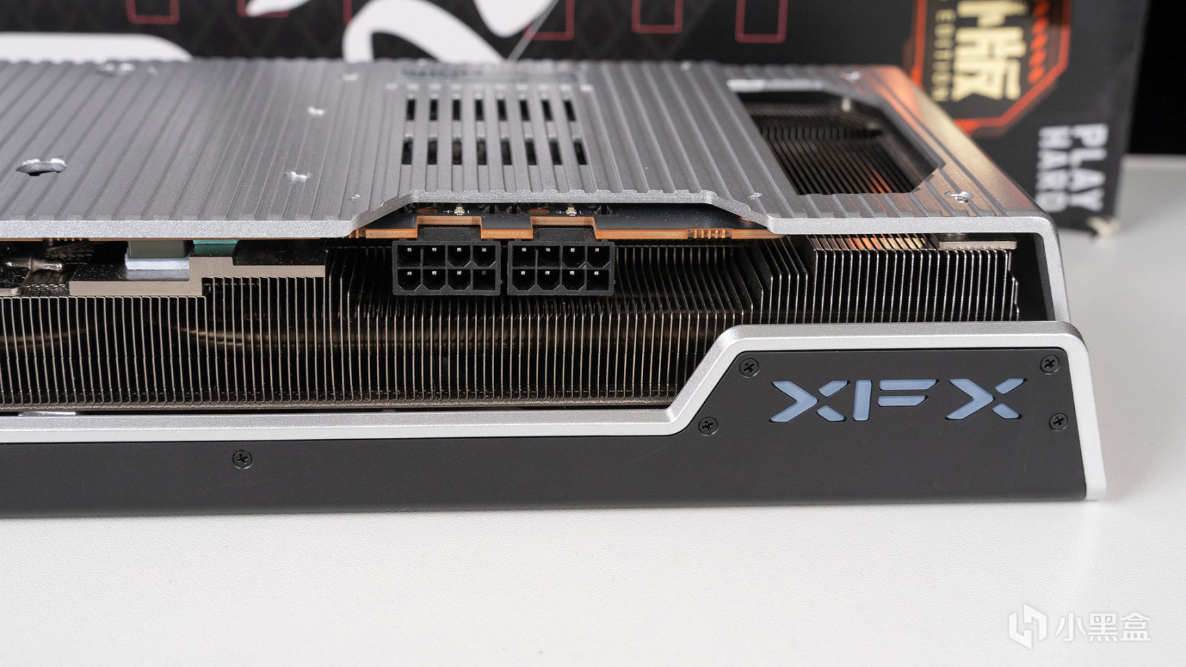 侧面轮廓和上一代RX 6000海外版系列相似,RADEON和XFX的LOGO安排在两侧,不过这一代海外版LED效果仅限于XFX LOGO,而且只是白色LED,相当朴素简洁符合国外用户的胃口,左侧区域有一个双BIOS切换开关(需要在重启时切换)。