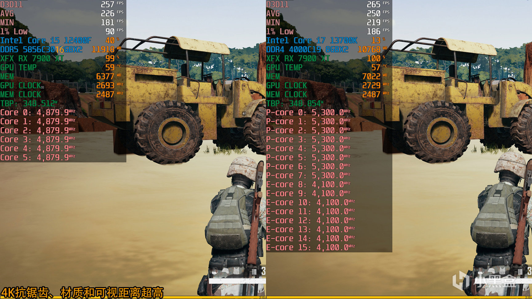 《绝地求生》4K分辨率抗锯齿、材质和可视距离超高,i5-12400F+RX 7900 XT海外版Pro平均帧数为226fps,i7-13700K+RX 7900 XT海外版Pro平均帧数为250fps