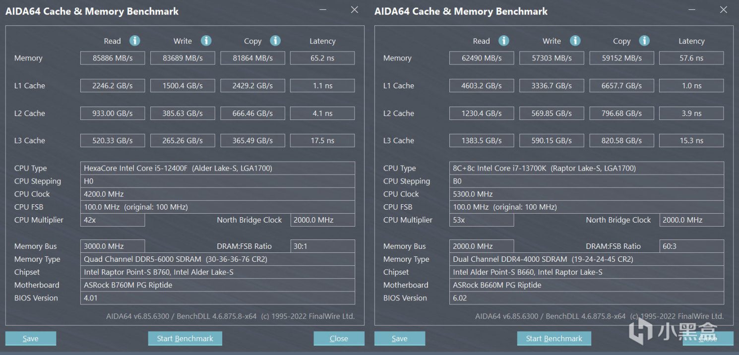 AIDA64内存和缓存测试,两套平台分别均开启XMP配置达成DDR5 6000和DDR4 4000(Gear 1模式),因为处理器不同读取、写入和复制性能也会有数据出入,但是能明显看出DDR5带宽性能还是秒天秒地般的存在,而DDR4 4000优势在于延迟方面。值得一提的是,i5-12400F+DDR5的测试并没有在超外频情况下跑,因为软件会有计算BUG。
