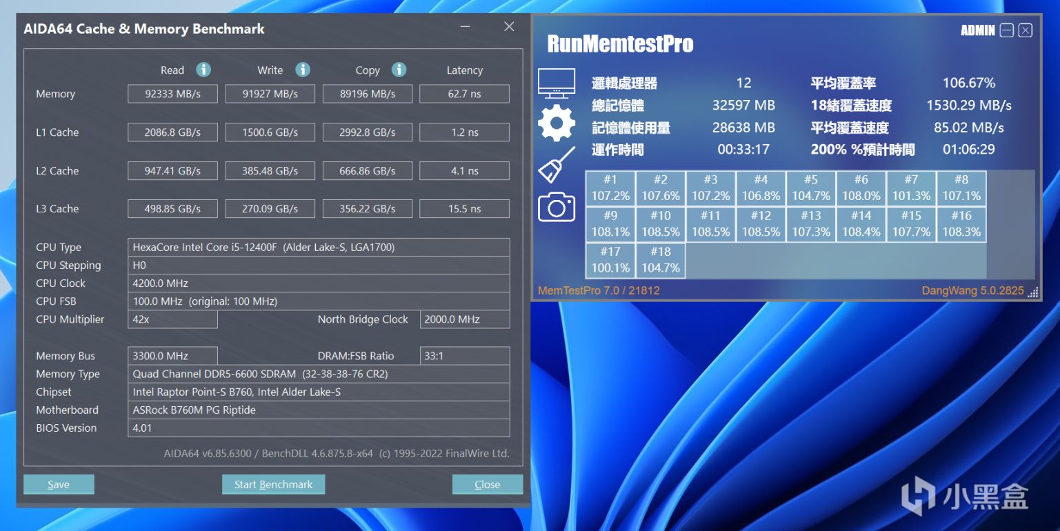 战斧·赤焰红白DDR5 6000 CL30-36-36-76超频至DDR5 6600 C32-38-38-76,通过RunMemtestPro 100%一轮烤机测试