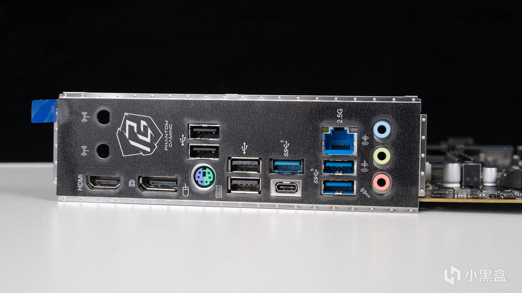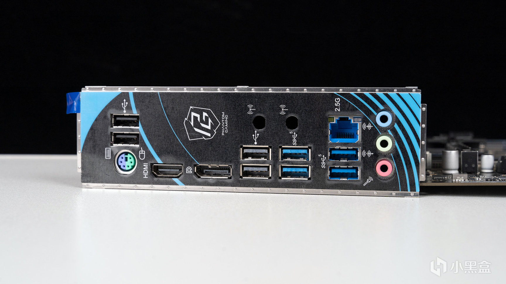 B760M PG Riptide的后窗I/O接口一览,包括4*USB 2.0、3*USB 3.2 GEN1 Type A、1*USB 3.2 GEN1 Type-C、PS/2键鼠接口、1*HDMI、1*DP、RJ45网口(Dragon 2.5G网卡)以及3*音频插孔(Realtek ALC897),整体配置看下来中规中矩,完全够用了。