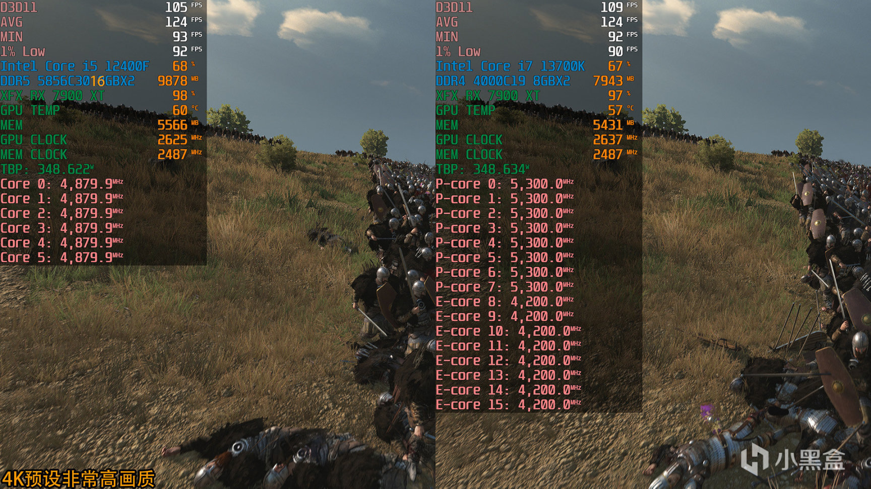《骑马与砍杀2》4K分辨率预设非常高画质,i5-12400F+RX 7900 XT海外版Pro平均帧数为124fps,i7-13700K+RX 7900 XT海外版Pro平均帧数为124fps