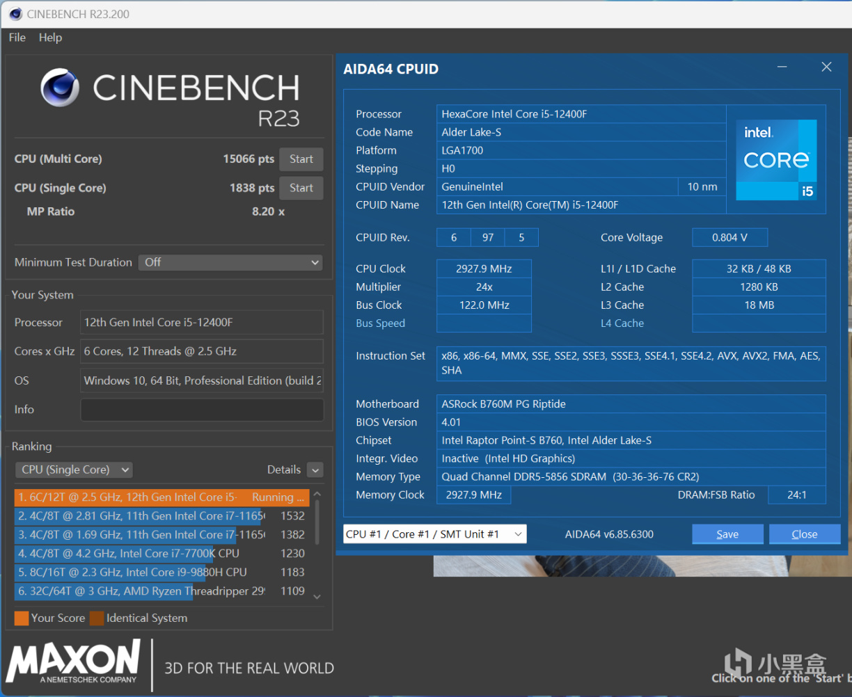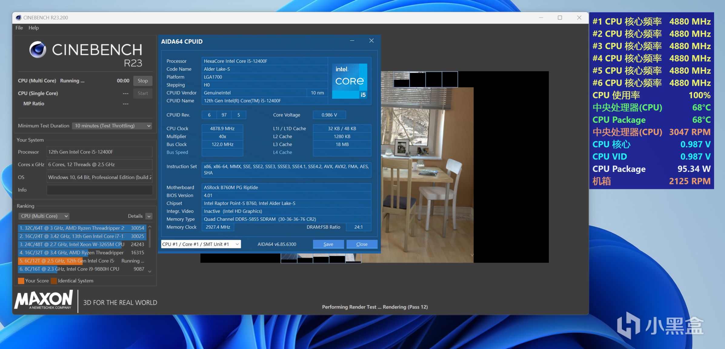 i5-12400F@4.88GHz跑十分钟CINBENCH R23的成绩,多核达到15066 pts,单核则是1838 pts,前者相比默认提升高达21%,而后者也有7%左右提升幅度,单核性能来说已经追上最新一代的i5-13490F,而多核基本是跟着Ryzen 5 7600X后面走了。