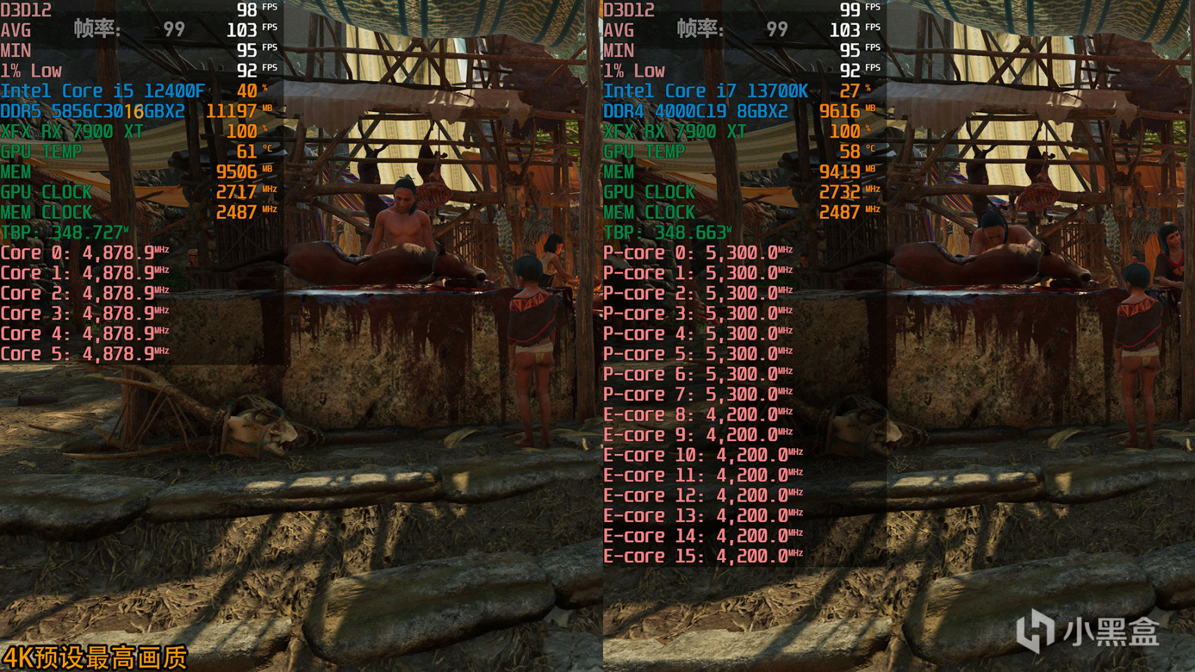 《古墓丽影:暗影》4K分辨率预设最高画质,i5-12400F+RX 7900 XT海外版Pro平均帧数为103fps,i7-13700K+RX 7900 XT海外版Pro平均帧数为103fps