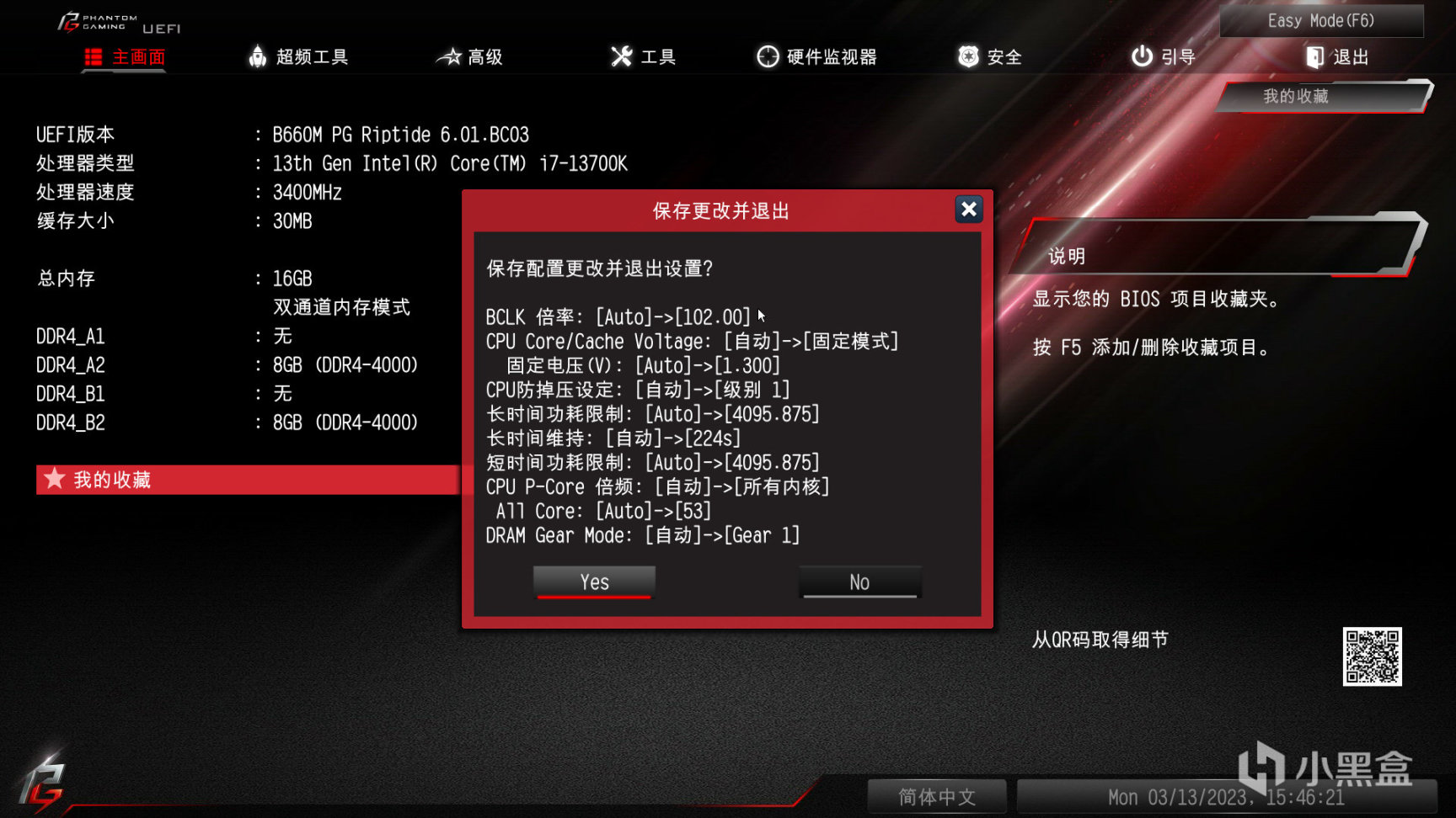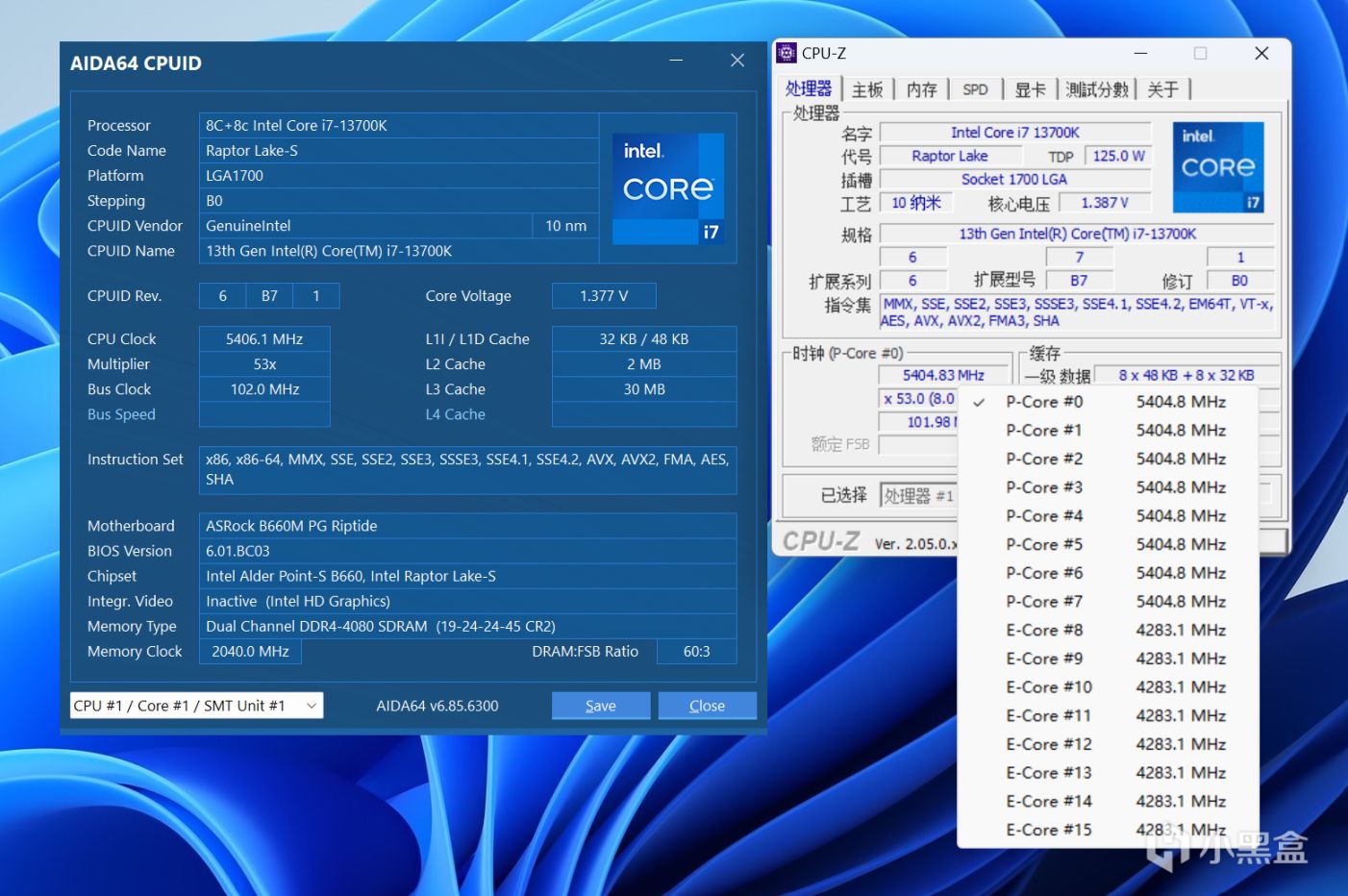 B660M PG Riptide超频十三代K系列需要用到6.01版本的内部BIOS(官方的6.02是不支持的),不过手上这颗i7-13700K并不给力,只能达成102外频*53倍频的结果,而稳定DDR4 4000 Gear 1是完全没问题的。