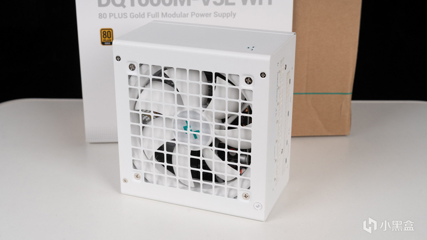 电源是九州风神DQ1000M-V3L WH白色版本,外观是偏向简约风格的,散热格栅是规则的方形开孔,内嵌120mm的FDB风扇,在40%以下的低负载使用场景中会停转,电源整体长度为14cm,尺寸在相同功率的ATX电源中算是比较紧凑的。