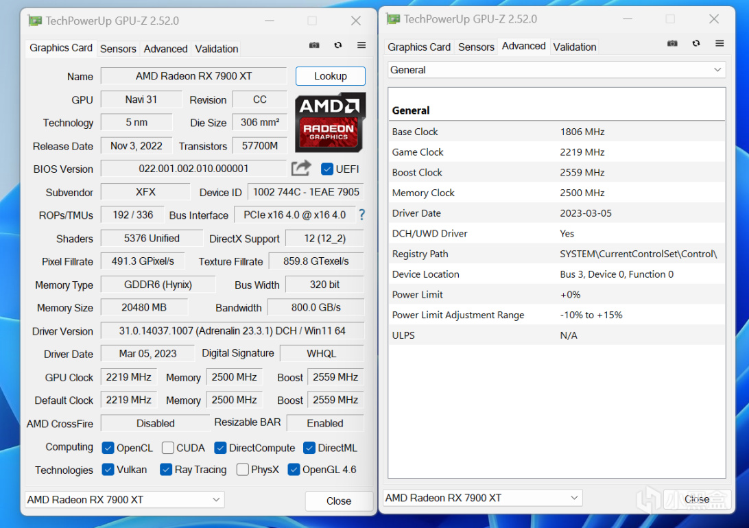 接下来是显卡部分,使用的是靠左边档位的BIOS,Boost频率可以达到2559MHz,比AMD标定的2400MHz高出不少,甚至还要比RX 7900 XTX都要高,除此之外RX 7900 XT海外版Pro还可以在315W基础上开放+15%功耗上限,下面3DMark理论测试部分就用i7-13700K跑,且开启Resizable BAR技术。