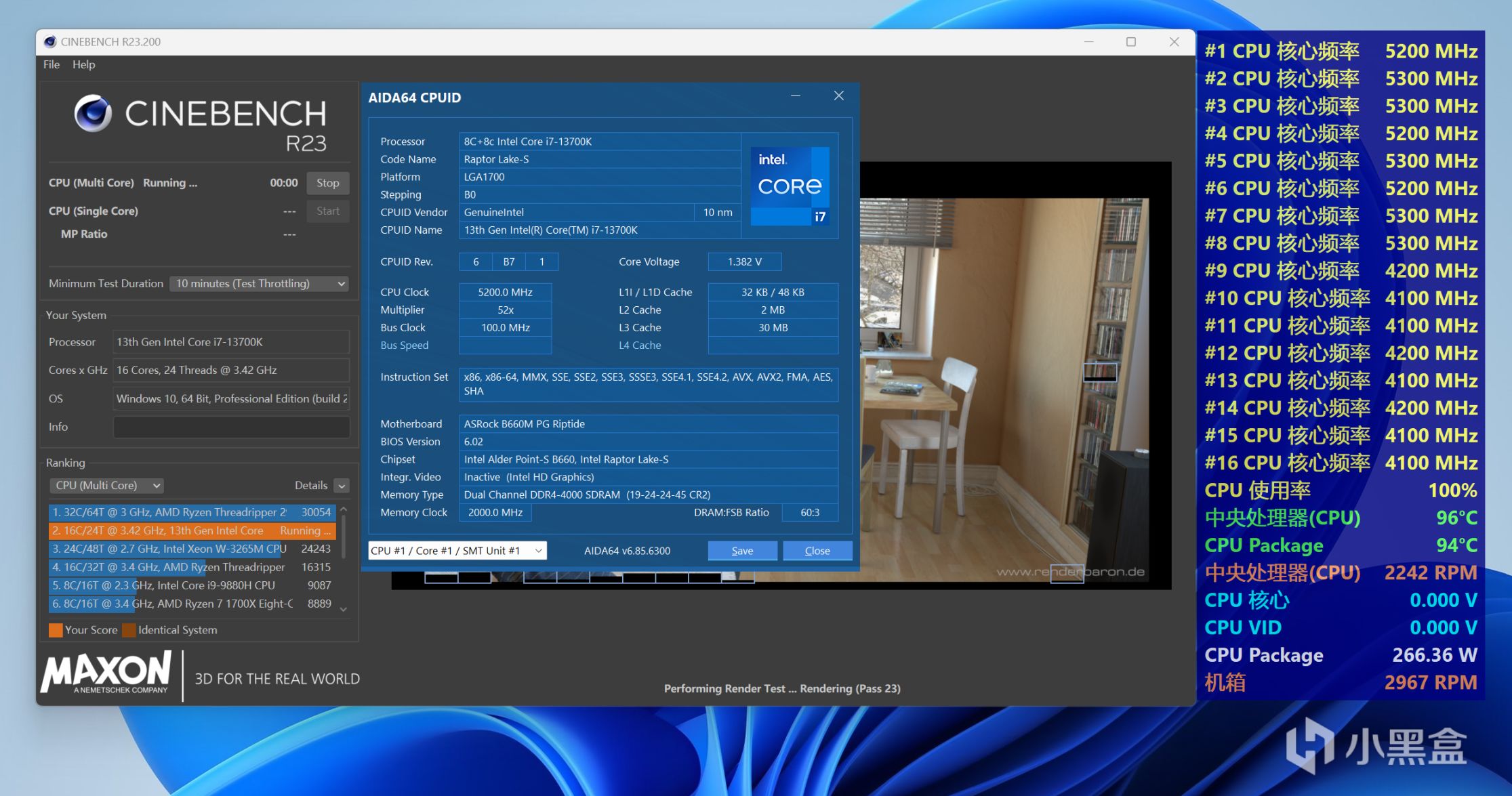 为了测试下B660M PG Riptide抗压程度,这里用i7-13700K默频跑了CINBENCH R23十分钟循环测试,因为B系主板分配核心电压会比较高,在1.386V电压下CPU Package温度在最后一轮测试中最高是94℃,不过由于主板和散热器比较给力,把CPU压制在100℃以内,可以看到只有部分P核心和E核心掉了0.1GHz,工作功耗可达到266W。