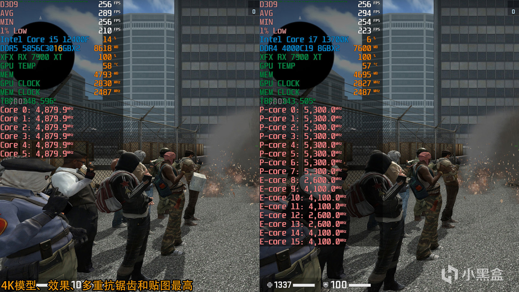 《CS:GO》4K分辨率模型、效果、多重抗锯齿和贴图最高,i5-12400F+RX 7900 XT海外版Pro平均帧数为289fps,i7-13700K+RX 7900 XT海外版Pro平均帧数为294fps