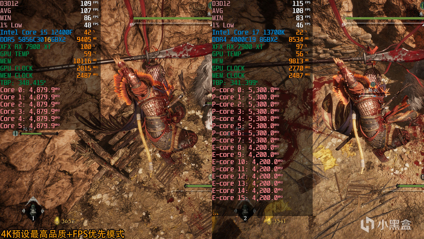 《卧龙:苍天陨落》4K分辨率预设最高品质+FPS优先模式,i5-12400F+RX 7900 XT海外版Pro平均帧数为107fps,i7-13700K+RX 7900 XT海外版Pro平均帧数为108fps